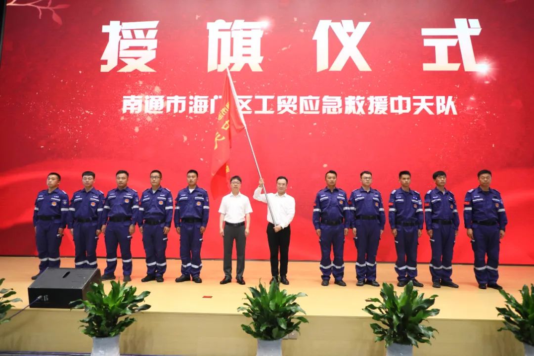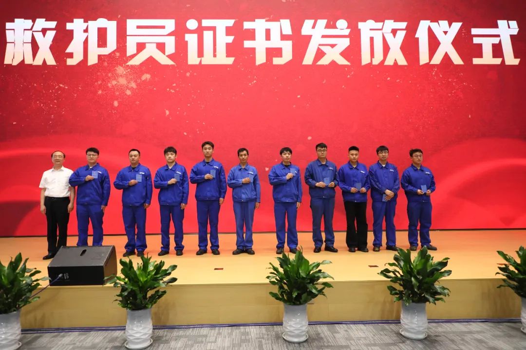 活动现场,中天南通公司正式成立南通市海门区工贸应急救援中天队,海门区应急管理局局长葛小军为救援队授旗,海门区红十字会党组书记、常务副会长杨曙光为首批通过考核的应急救援队代表颁发《红十字初级救护员证》。
