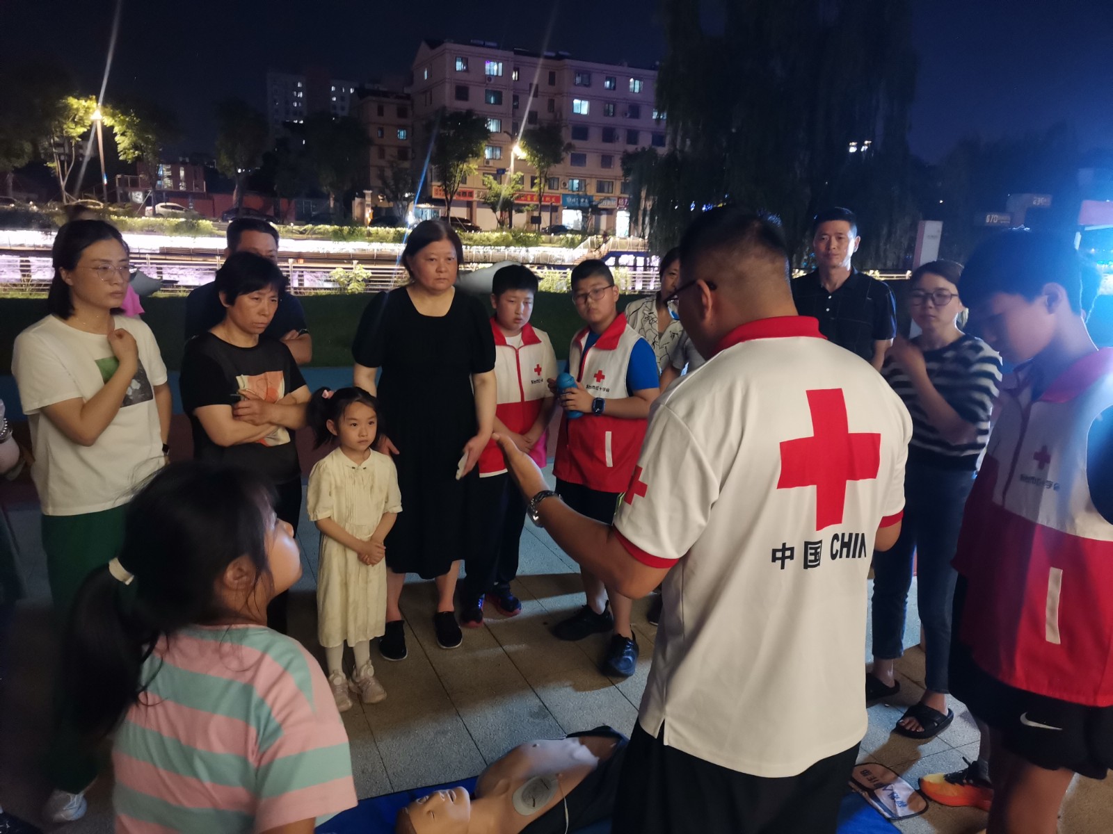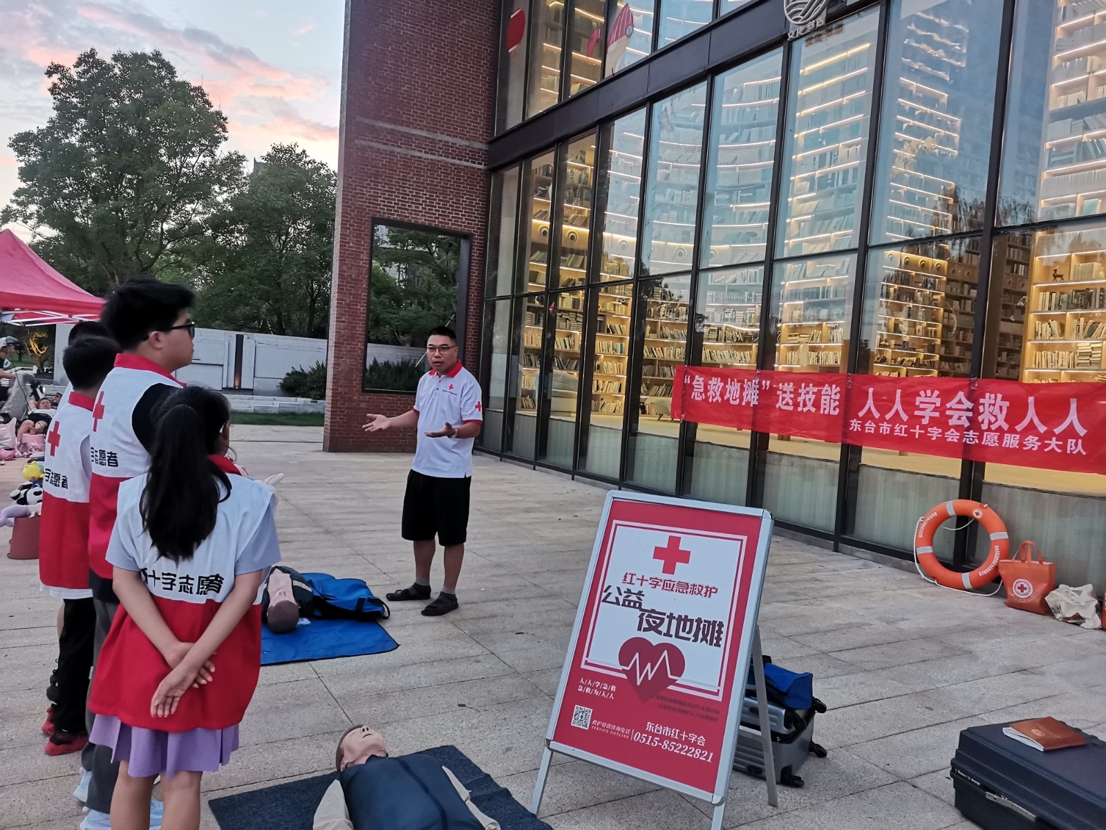 7月6日晚,东台红会在七里漾、悦来城等地人流量大的地方,开展“急救地摊送技能”和预防溺水 救在身边——“博爱泳安”公益宣传活动,多摊联动。这是今年“红十字应急救护——公益夜地摊”活动的第4场。