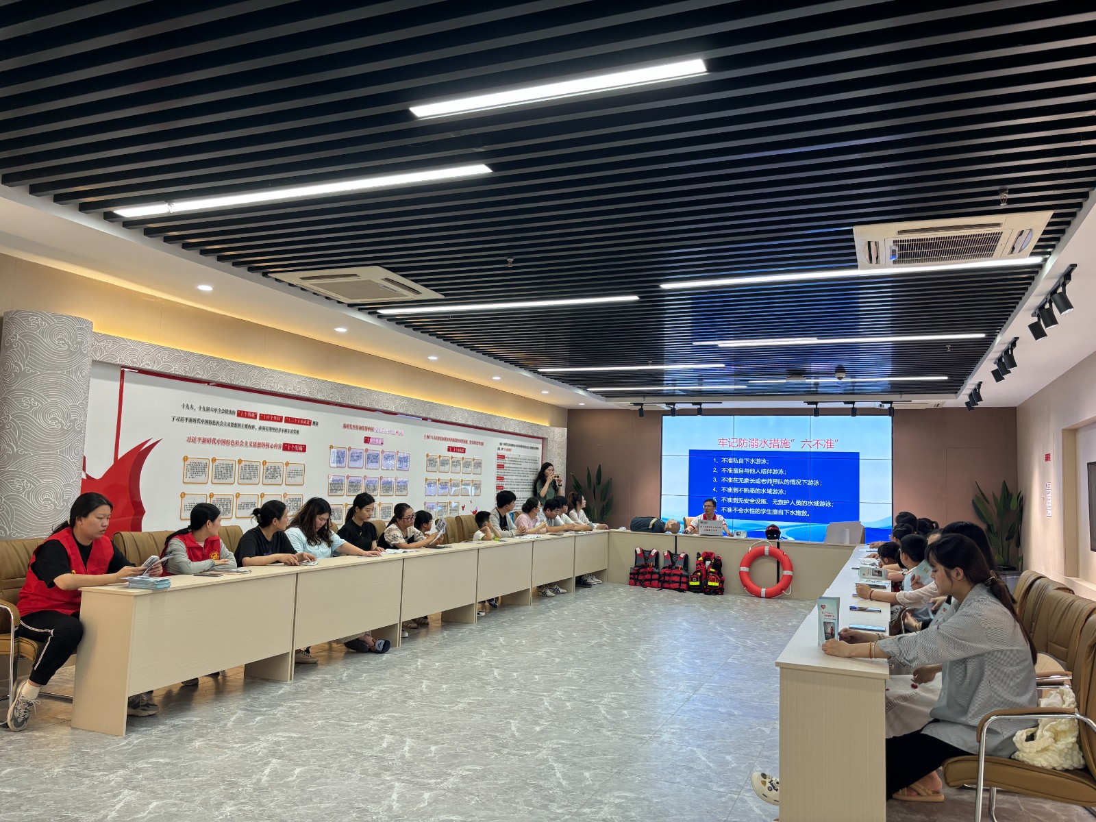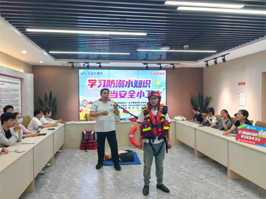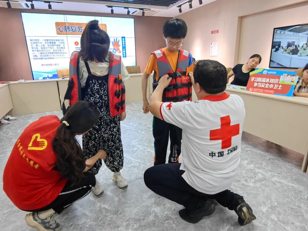 活动中,红十字志愿者向大家讲授防溺水、自救互救技巧等知识,分享日常生活中的典型案例,让孩子们意识到溺水的严重后果。现场演示救生衣的正确穿戴方式,通过人体仿真模型进行急救示范,邀请孩子们上前体验,让大家对防溺水有了更直观的认识。