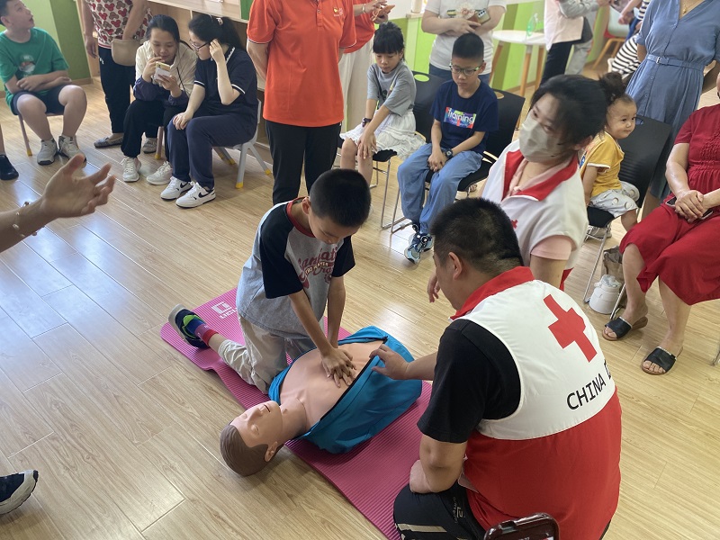 活动现场,红十字志愿者首先向大家详细讲解了心肺复苏、海姆立克法等急救知识和技能,接着在理论的基础上进行了心肺复苏的实操演示,让在场青少年都更加直观地了解和掌握到基本操作要领。教学过后,青少年踊跃报名,纷纷加入到模拟实操当中。