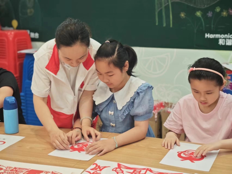 本次剪纸活动内容由无锡市梁溪区优秀党员传统文化剪纸非遗传承人江丽萍奶奶教孩子们制作西游记主角——孙悟空。活动开始,江奶奶向大家介绍了剪纸的历史传承和文化底蕴。红十字志愿者和孩子们围坐桌边,孩子们一边认真学习剪纸的技巧,一边亲手实践,年纪小的孩子在志愿者的帮助下一起动手,不一会儿的功夫,精美的图案便栩栩如生的跃然于纸上。大家开心地拿着自己的剪纸作品进行展示,既得到了锻炼,又为自己收获了一份颇具心意的爱心暑期礼物。