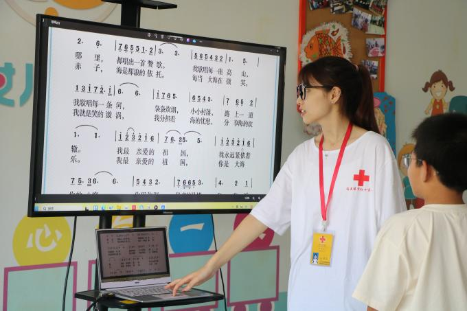 红歌代代传,歌声献给党。志愿者带领小朋友学唱《我和我的祖国》和《红星闪闪》,孩子们用稚嫩的童音演绎着一首首鼓舞人心的歌曲,脸上洋溢着的笑容与迸发出的热情足以感动在场的每一个人。现场的热闹氛围在一首《孤勇者》中到达了高潮,孩子们随着音乐伴奏,有节奏地拍着双手。最后,孩子们在集体大合唱《没有共产党就没有新中国》中结束了这次的活动。