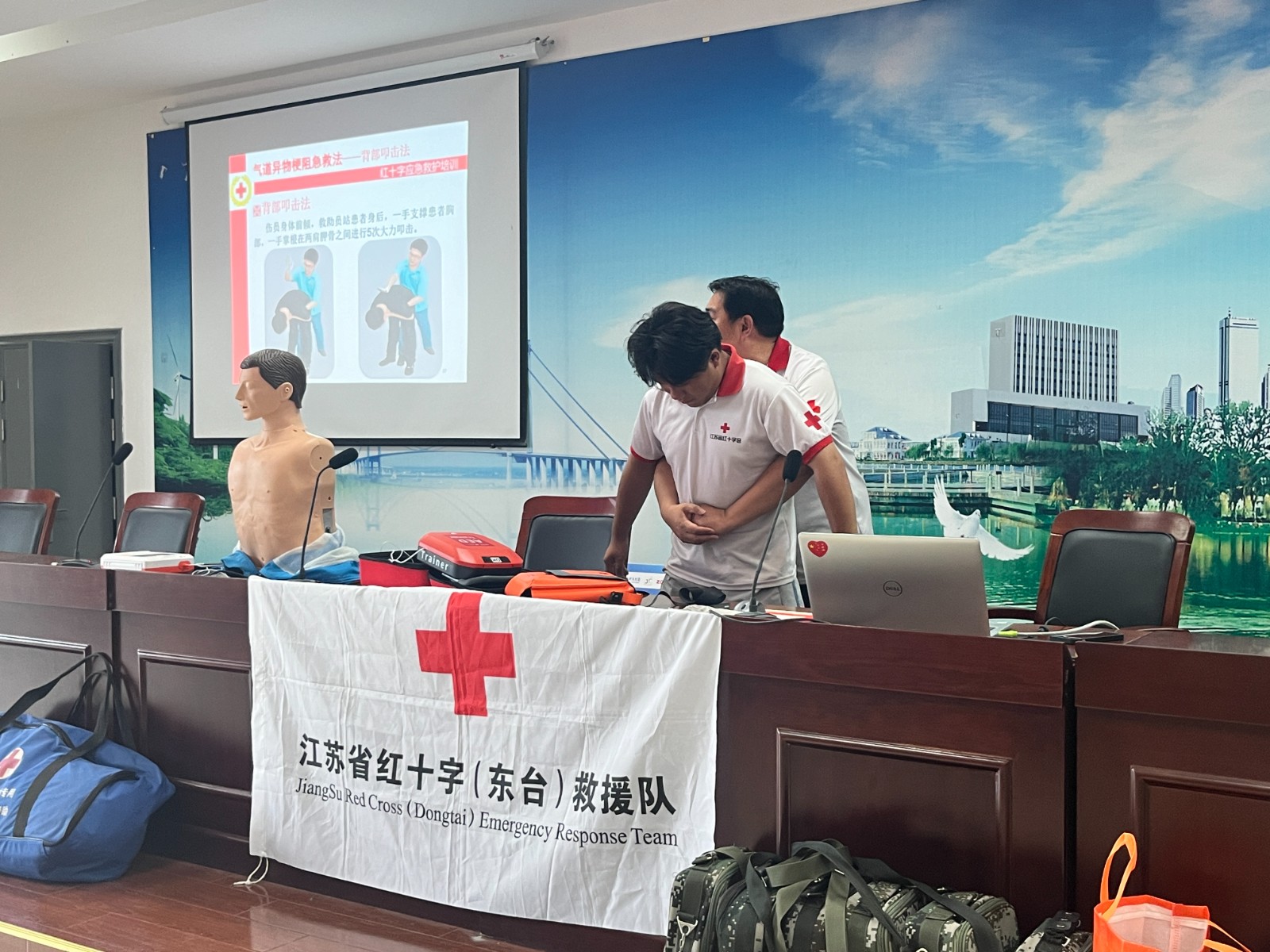 应急救护师资讲解了红十字运动的发展史、红十字精神以及现代应急救护的新概念、CPR的实施、AED的使用、气道异物梗阻的急救方式等知识。培训后对参训的民兵进行了理论与实践考试。