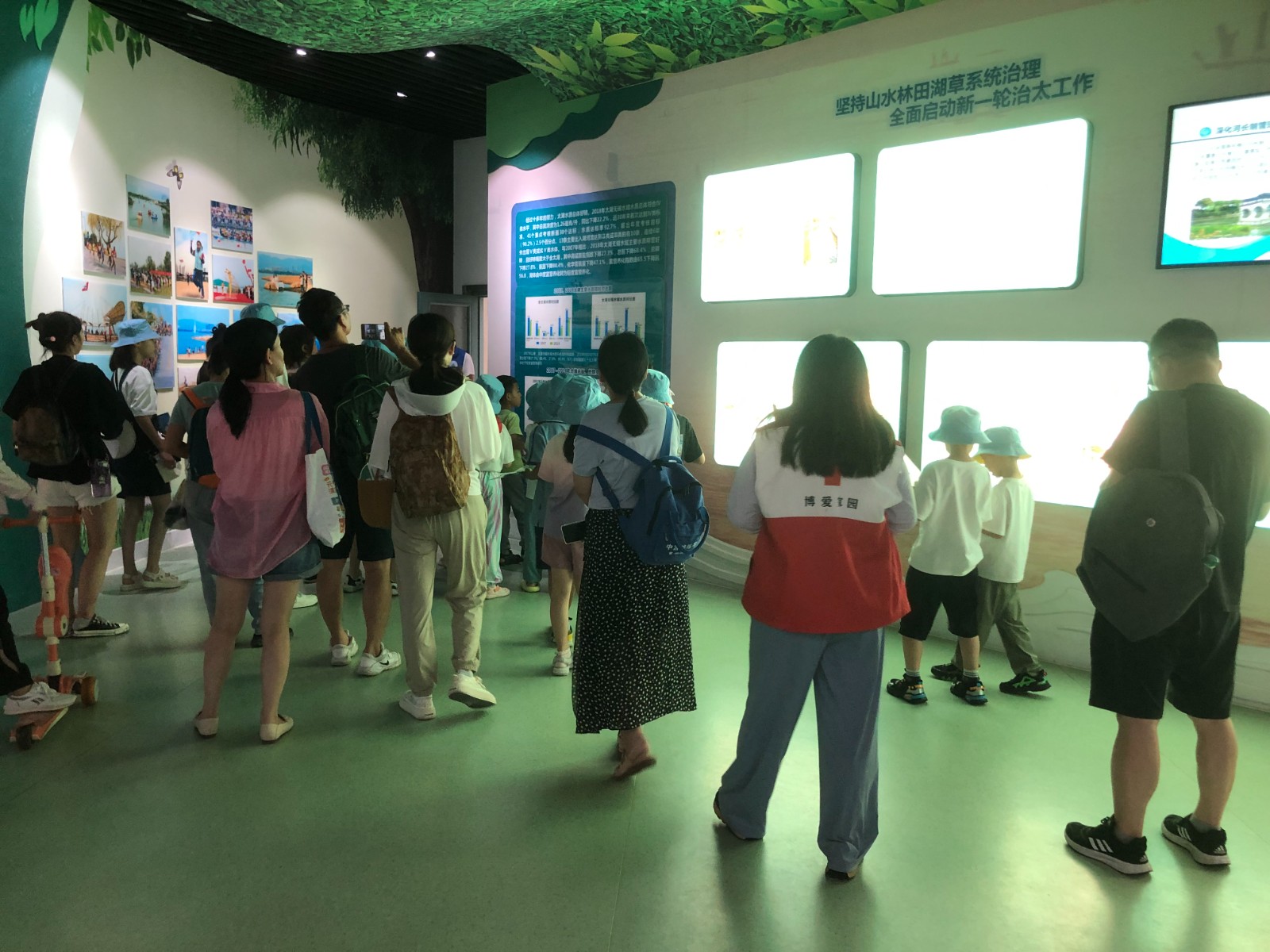 7月12日,社区红十字会先在渤公岛蠡湖展示园举行简短的开幕式,简单介绍活动背景、目的和意义,鼓励青少年积极参与并学有所获,增强青少年的环保意识和责任感。随即在志愿者的带领下进行学习参观。通过图文展板,实物模型、多媒体等展示方式,展示馆详细记录了蠡湖地区生态环境治理的历程和成效,包括退渔还湖、生态清淤、挡污截流、生态修复、动力换水等科学流程。青少年们了解到这些工程对改善水质、提升生态环境的重要作用。从展示馆出来,在志愿者的带领下来到梅梁湖泵站,参观泵站厂房、节制闸等配套设施,近距离感受水利工程的壮观和力量。通过参观加深对水利工程的理解和认识。