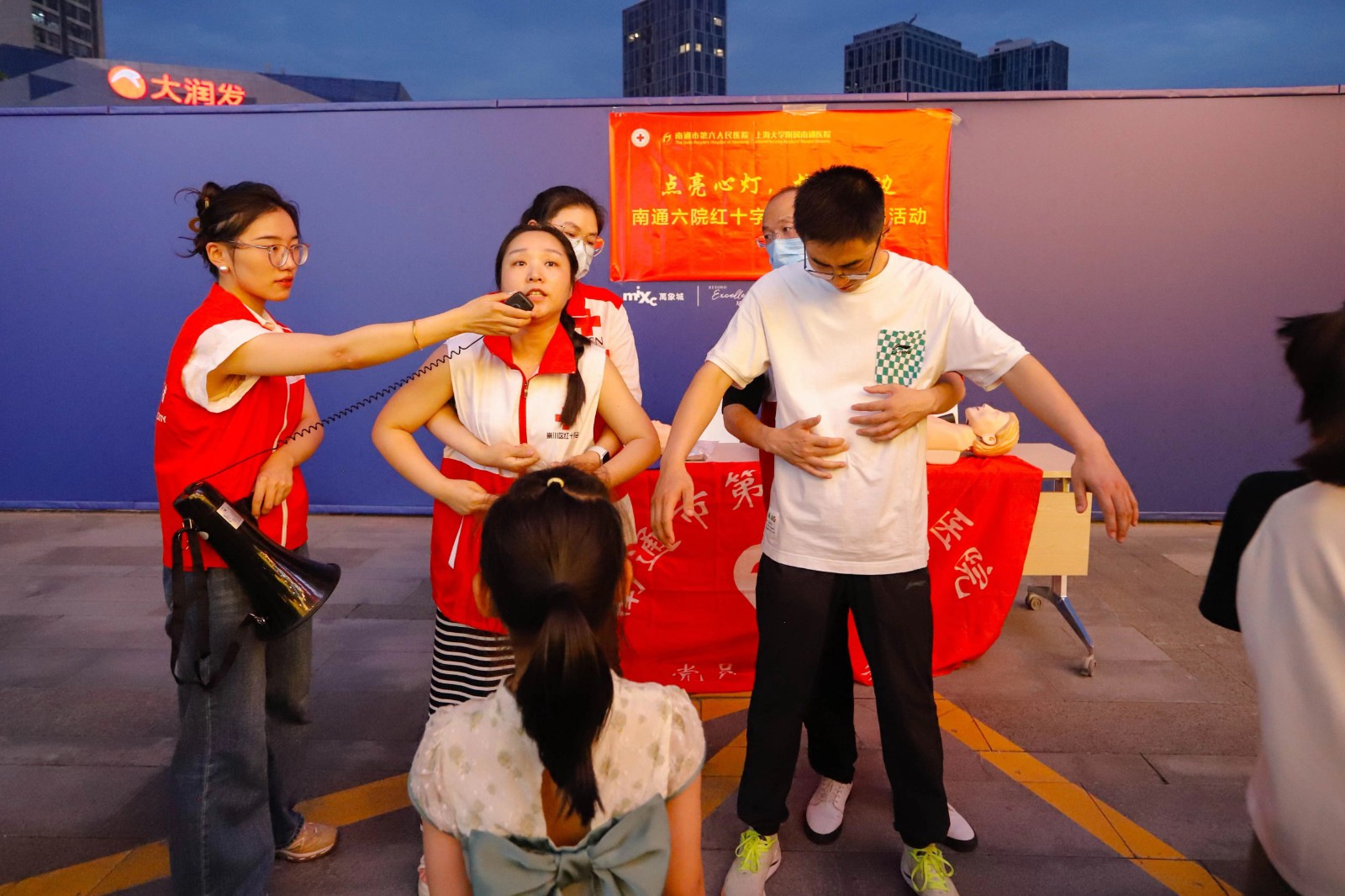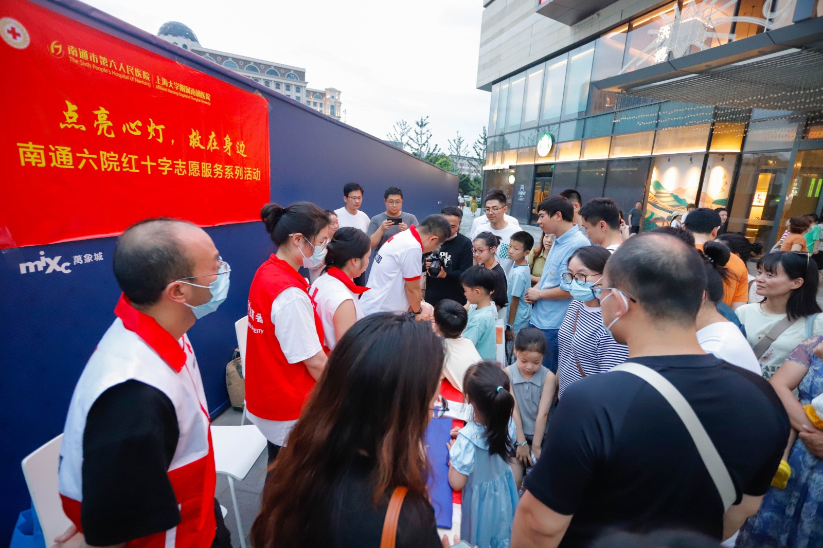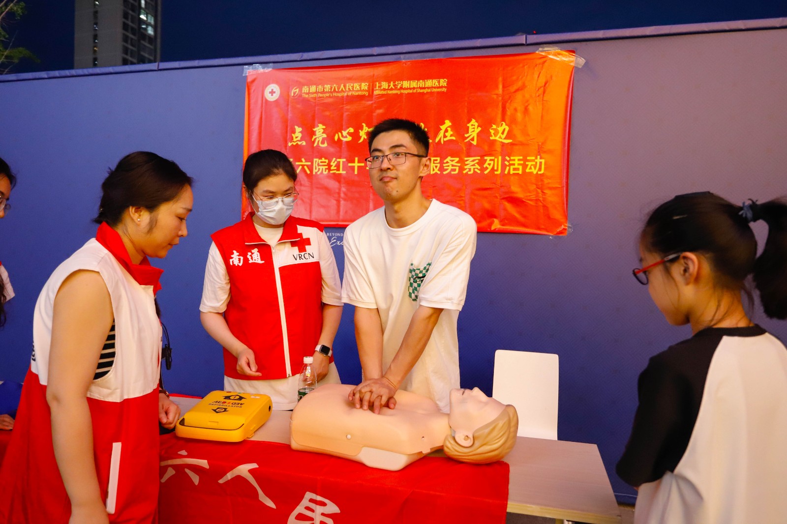 7月20日夜晚,崇川区红十字会与南通六院共同开展的“点亮 ‘心’灯,‘救’在身边”夜习急救系列活动在万象城门前广场拉开序幕,来自市六院急诊科、全科医学科、公共卫生科的红十字党员志愿者搭起的公益急救知识摊位,在热闹的街头,成了一道别样的红色风景线。