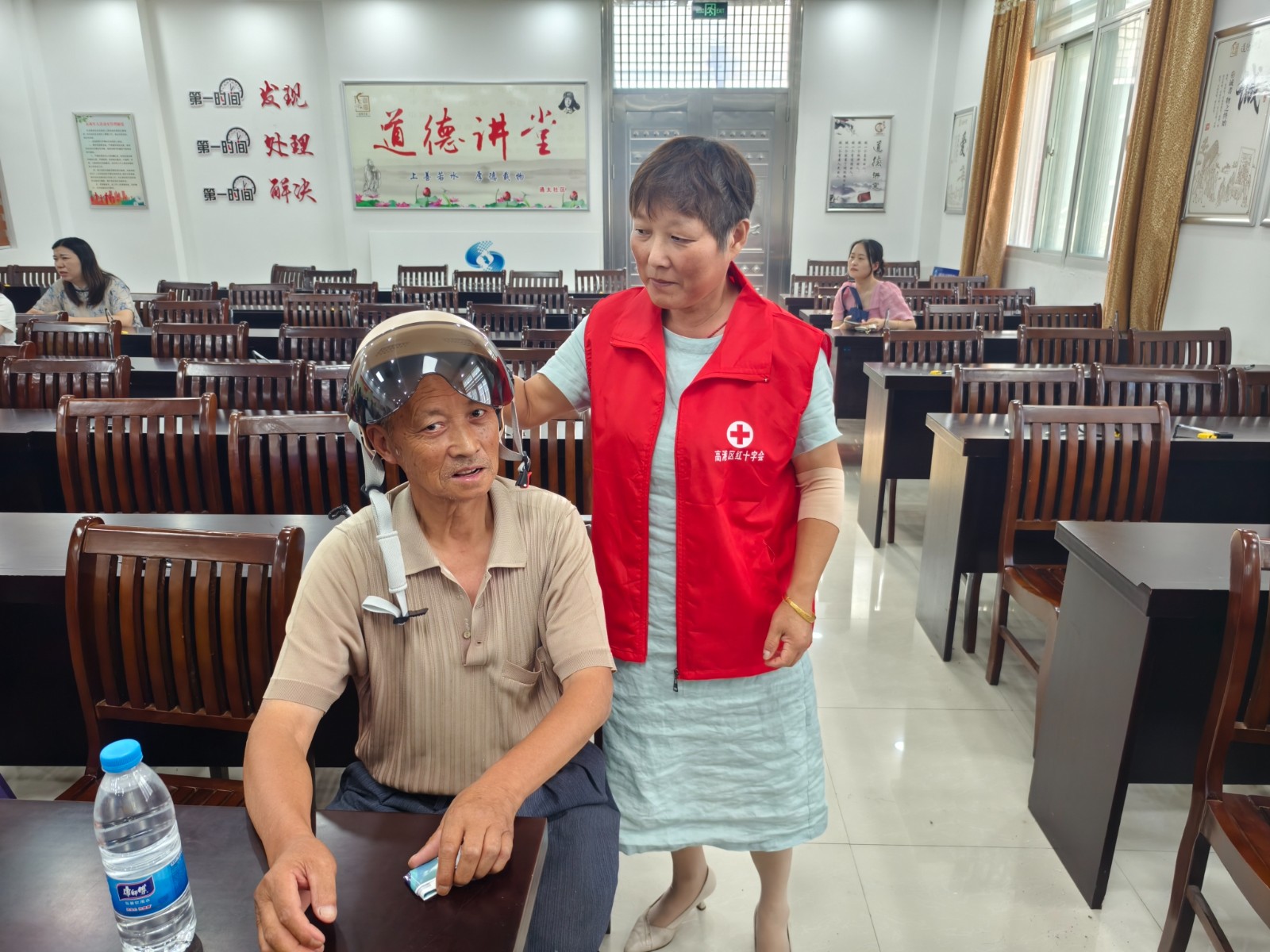 随着交通工具的普及,摩托车、电动自行车等成为许多人日常出行的选择。然而,由于部分骑乘人员缺乏安全意识,不佩戴头盔或佩戴不规范的现象时有发生,这极大地增加了交通事故中头部受伤的风险。为进一步增强辖区群众交通安全意识,7月25日下午,刁铺街道红十字会在通太社区开展“头盔安全 从我做起”宣传活动,把道路交通安全知识送到群众身边。