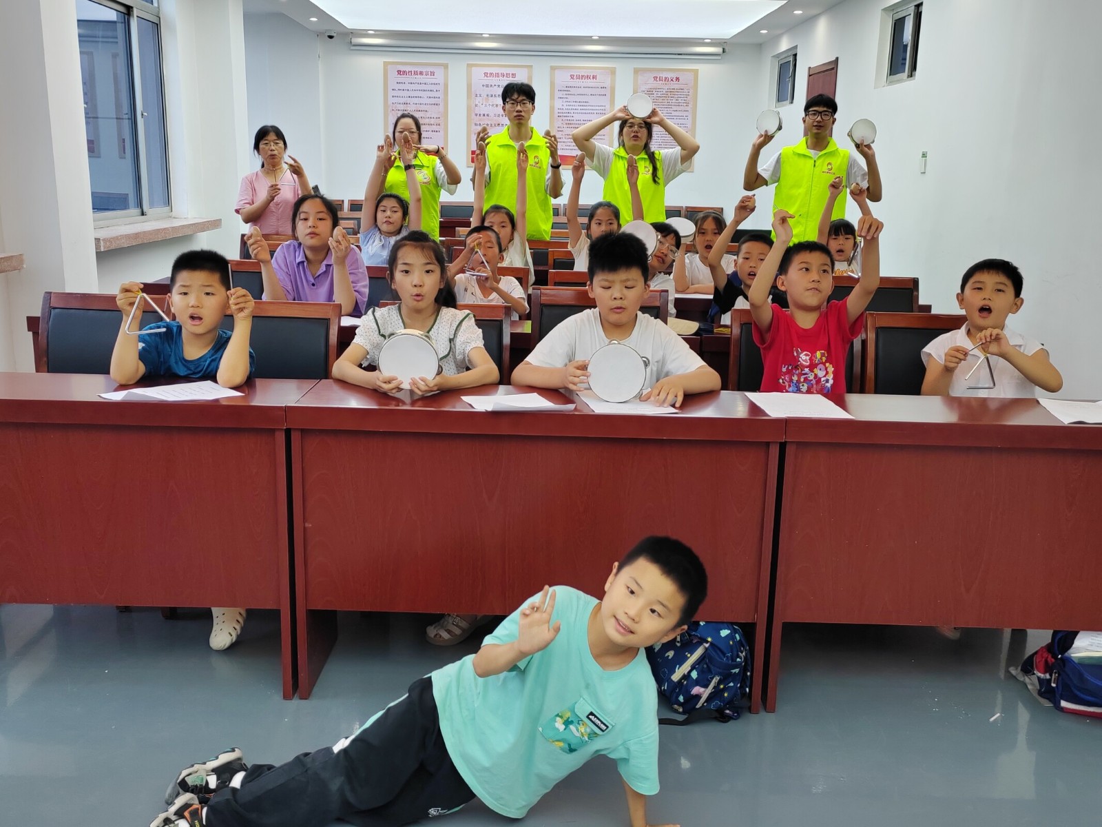 下午,志愿者轻启音乐之门,引领着孩子们踏入了爱国旋律的海洋。他们首先播放了歌曲《我和我的祖国》的旋律,那熟悉的音符如同潺潺溪流,缓缓流淌进孩子们的心田。志愿者耐心地一句句教唱,孩子们则用他们稚嫩而真挚的声音,一字一句地跟唱着,仿佛在用歌声表达对祖国的深情厚谊。孩子们手中拿着各种奥尔夫乐器,他们或拿起小鼓轻轻敲打,或摇动沙锤发出清脆的声响,或吹奏着简单的旋律管,在志愿者的指挥下,共同奏响了《我和我的祖国》。音乐响起,孩子们的动作与旋律完美融合,每一个音符都跳跃着欢快的节奏,每一段旋律都流淌着对祖国的热爱与赞美。