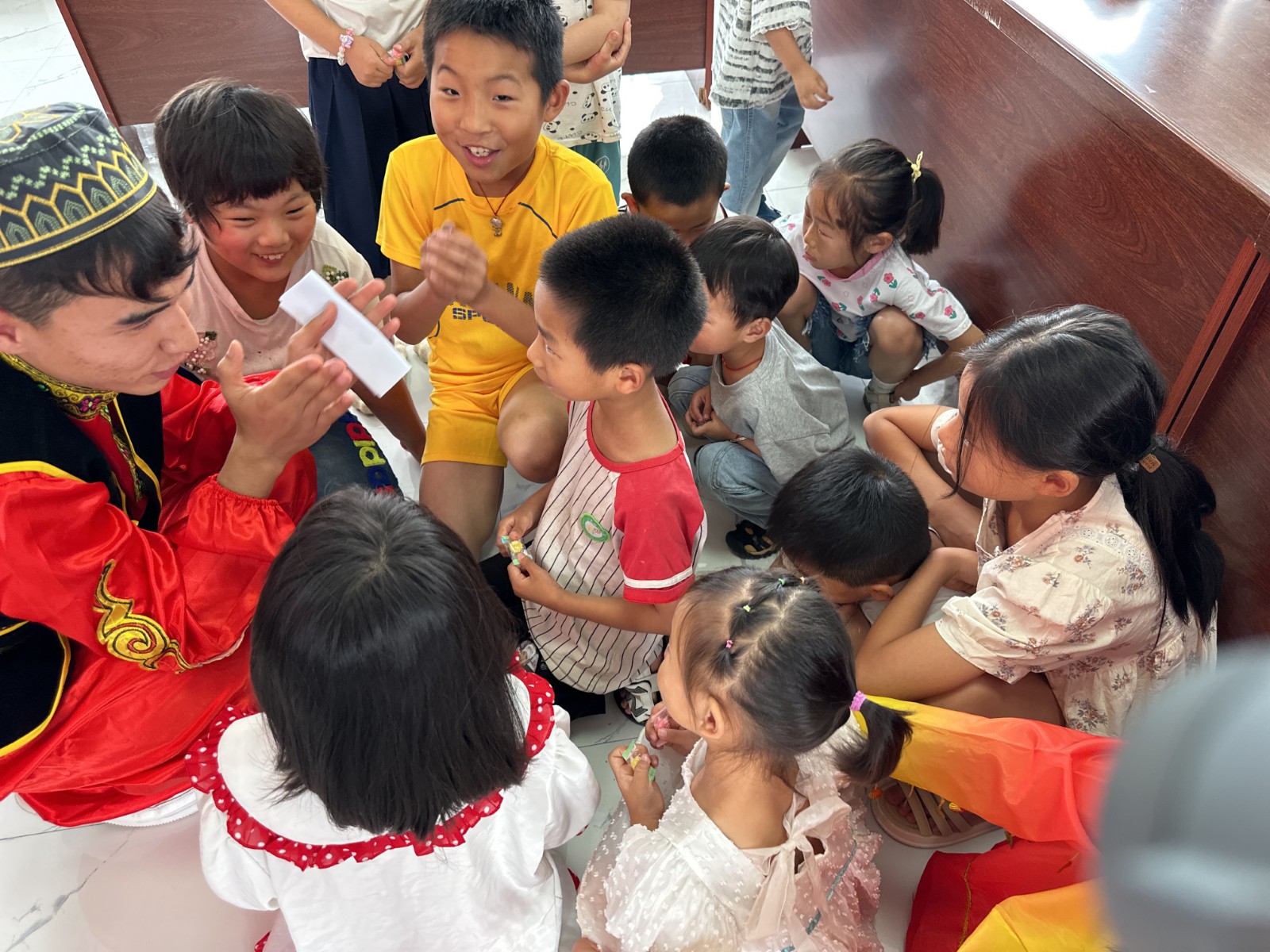 上午九时,随着欢快的音乐响起,活动在四里村村委会活动室正式拉开帷幕。来自维吾尔族、傣族和布依族的志愿者们身着各自民族的特色服饰,宛如一道道亮丽的风景线,瞬间吸引了孩子们的目光。他们首先为孩子们带来了一场精彩的民族歌舞表演,维吾尔族的热情奔放、傣族的柔美灵动、布依族的淳朴自然,在场的村民都沉浸在少数民族志愿者的精彩表演中。