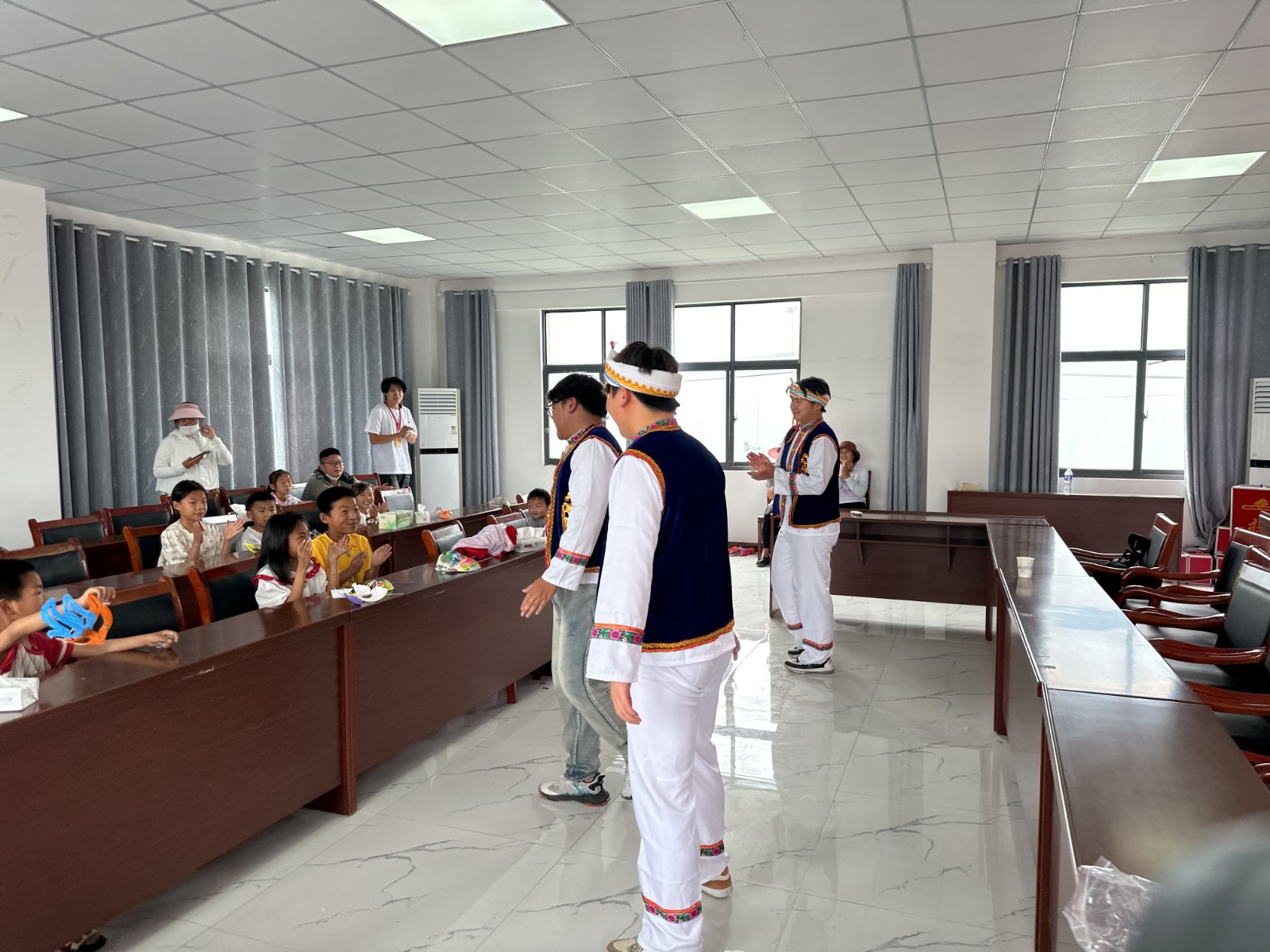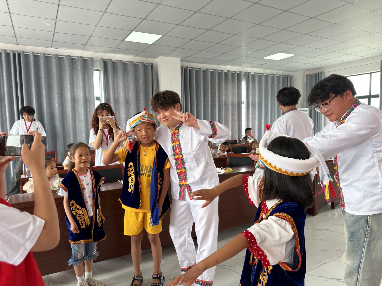 表演结束后,志愿者们并没有停下脚步,而是邀请孩子们参与到民族歌舞的学习中来。他们耐心细致地教授孩子们基本的舞蹈步伐和手势,从维吾尔族的“麦西热甫”到傣族的“孔雀舞”,再到布依族的“铜鼓舞”,每一个动作都力求精准到位,孩子们学得有模有样,虽然动作略显稚嫩,但那份认真与投入却让人动容。