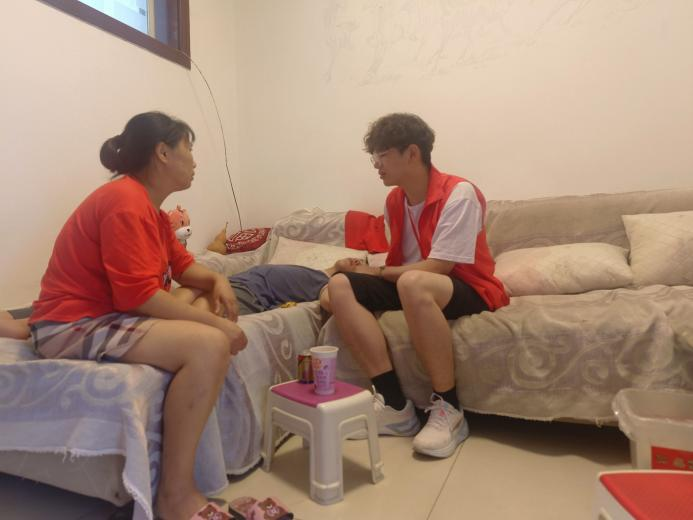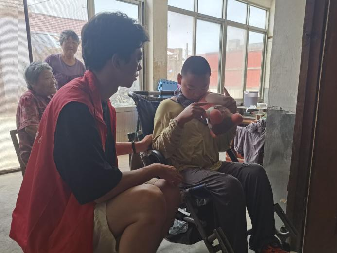 志愿者沙星宇、吕思越同学前往心智障碍者陶宏家,他是一个与志愿者年纪相仿的青年,却因出生时大脑缺氧而患有脑瘫。十九年来,他的父母始终如一地给予他无尽的关爱和照顾。陶宏看到志愿者的到来,脸上露出了无比开心的笑容。这份简单的陪伴,让他的眼中闪烁着喜悦的光芒。中午时分,陶宏的父亲为志愿者准备了一顿丰盛的午餐。在饭桌上,他与志愿者分享了许多人生的智慧和道理,让他们受益匪浅。午后,陶宏的母亲回忆起陶宏童年的点点滴滴,她的眼中不禁泛起了泪光。这些真挚的情感和故事,让志愿者深受感动,也让他们对人生的意义和价值有了更多的思考。
