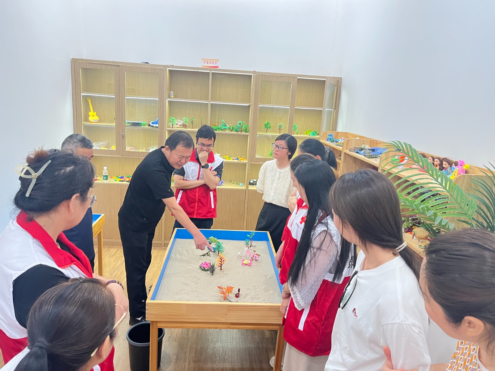 区红十字会心理健康服务队老师汤沁带领大家进行心理健康辅导与体验活动。用“沙盘”道具为志愿者们打造心理体验课。通过引导大家和沙子、沙具的链接,呈现潜意识的自由表达,真诚地面对自己。也通过游戏规则的设置,体会到自我需求的重要性,并且能体谅、包容他人对个体的干预,勇敢地表达内心的真实感受,感恩同伴的帮助和馈赠,能团结协作,站在他人的角度多考虑问题……