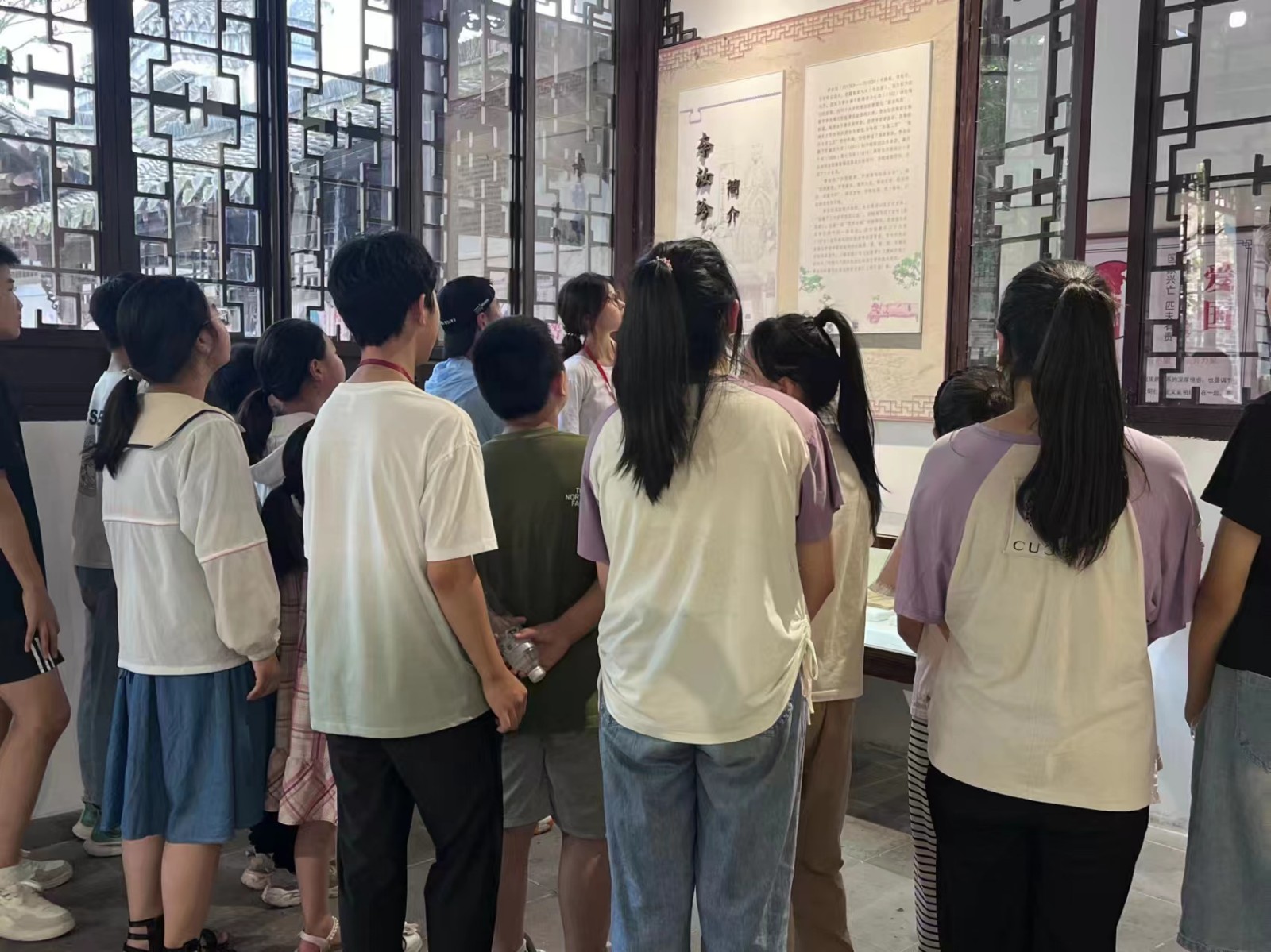 李汝珍纪念馆,是为纪念清代小说家李汝珍而建立的。作为一位杰出的文学家,李汝珍的著作《镜花缘》不仅在国内外享有盛誉,也被多次改编为影视作品,深入人心。在参观学习过程中,志愿者和孩子们认真学习了大厅陈列橱内展出的中外多种文字的《镜花缘》版本和国内外专家学者的学术论文、研究资料,不仅详细了解了李汝珍的生平事迹及其创作历程,更深刻意识到其是一位具有深厚文化底蕴和广阔视野的学者。他的作品《镜花缘》是如何以其独特的构思和丰富的文化内涵,成为中国古典文学的瑰宝,展厅后院的北墙上镌刻着“镜花水月”四个大字也与其交相辉映,把纪念馆映衬得更加古朴典雅。