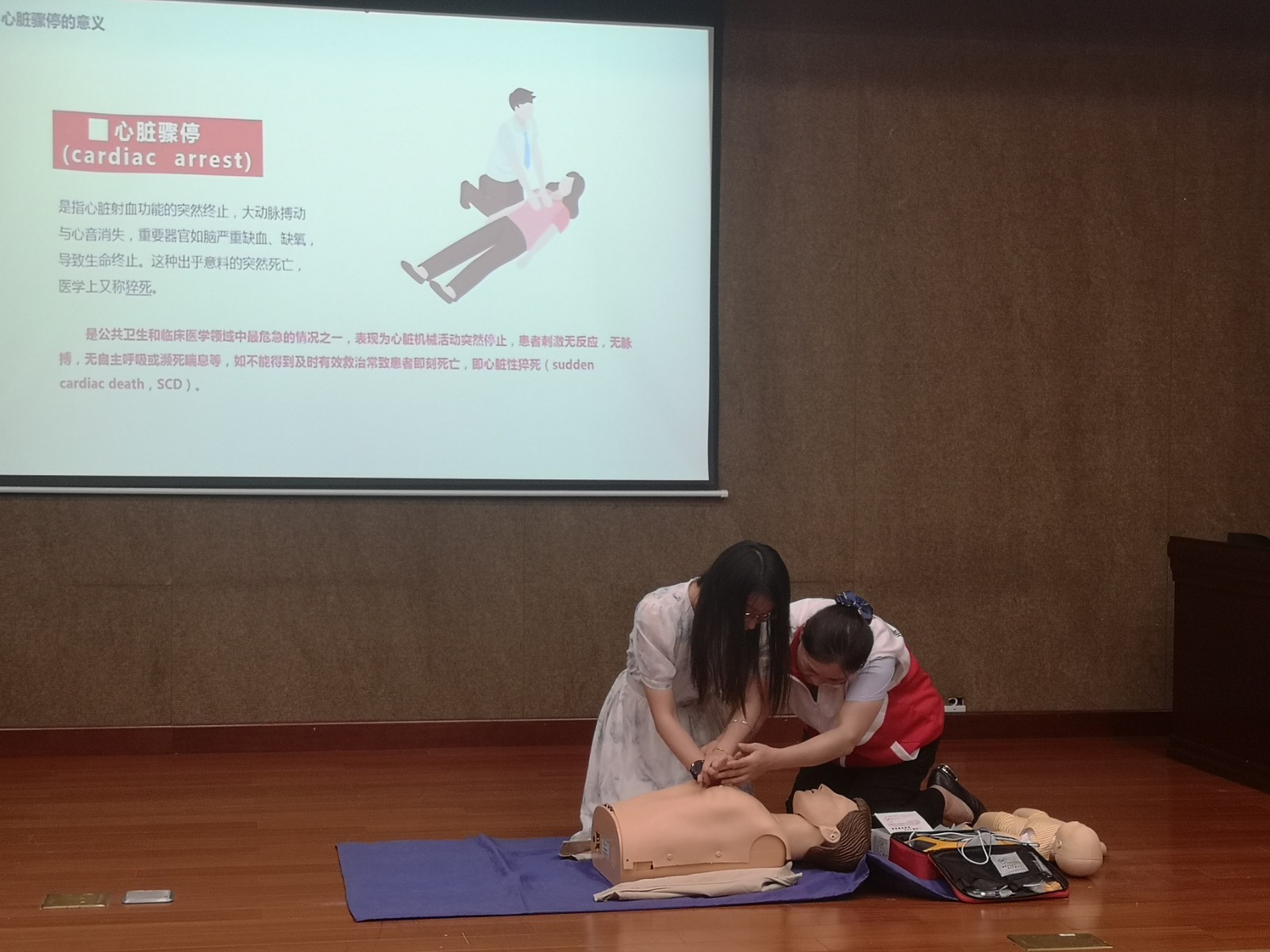 活动现场,崔队长通过实例讲解、示范操作、现场演练等形式,依托模拟器材形象地演示了心肺复苏、气道异物梗阻、体外除颤仪等各类急救技能,进一步提升了学员应急救护的能力,为应对紧急病患赢得“黄金”救援时间奠定了良好的急救基础。