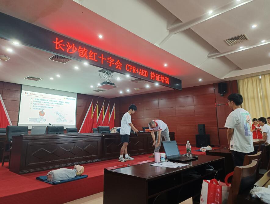 8月5日下午,长沙镇红十字会联合县红十字会在边检二楼会议室举办了一期红十字会CPR+AED培训班,59人参加了此次培训。县红十字应急救护培训老师用通俗幽默的语言,规范易懂的操作示范,从理论讲解、现场演示、实践操作等方面为参训人员讲授心肺复苏救护知识,大家都认真学习并全部通过考试。大家表示今天的培训让人受益匪浅,学到的应急救护技能不但增强了自救互救能力,而且在关键时刻还能帮助别人,挽救他人生命!