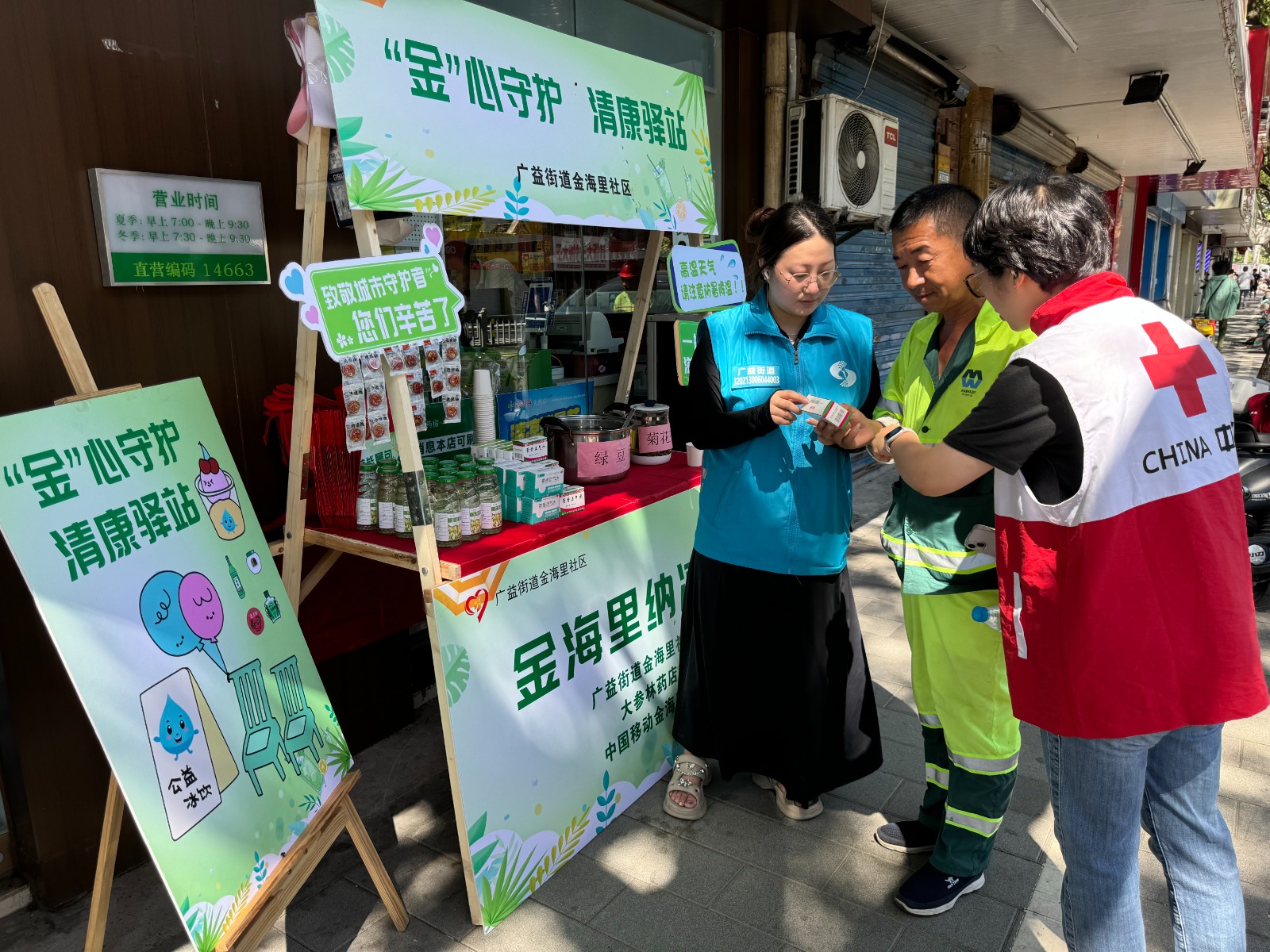 连日来,锡城持续高温,环卫工人、外卖骑手、城管队员、交警铁骑在炎炎夏日里坚守岗位,穿梭在市井长巷,维护城市秩序,守护人间烟火。广大户外劳动者的防暑降温措施牵动了金海里社区红十字会以及社区党建联盟单位工作人员的心。社区红十字会发动辖区党建联盟单位、爱心企业大参林药店、中国移动等在辖区内设立了3处“清康”纳凉驿站,为户外工作者提供一个可以歇歇脚、喝口水的避暑场所,为城市“汗”卫者撑起“降温伞”。