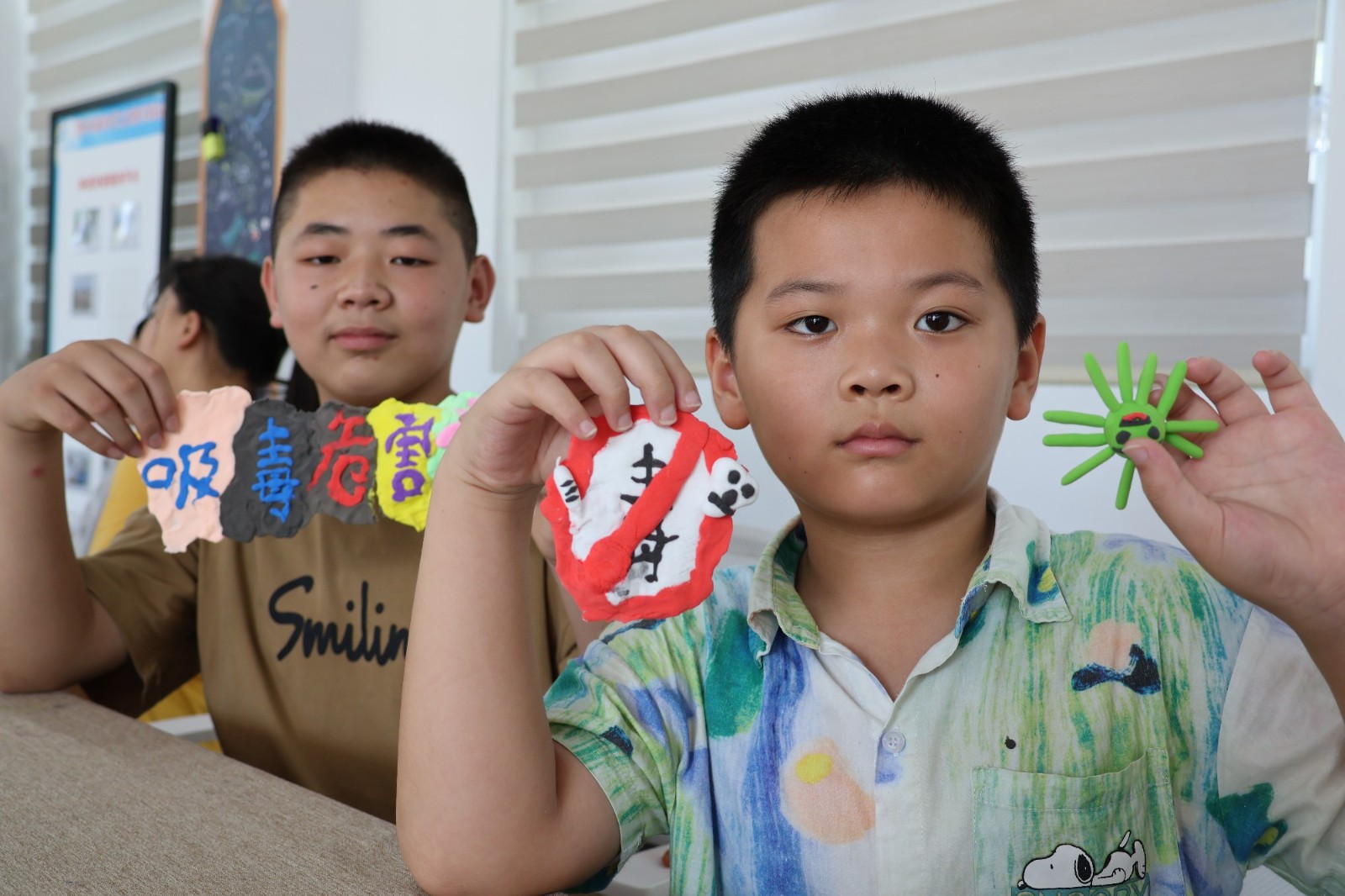 在知毒拒毒禁毒主题中,志愿者首先通过短片,为孩子们上了一场简短的禁毒教育课,带领孩子们一起了解毒品的种类和危害,教育孩子们珍爱生命、远离毒品。随后,孩子们将学到的禁毒知识,用黏土手工的方式展现出来,在快乐的手工活动中增强禁毒意识。