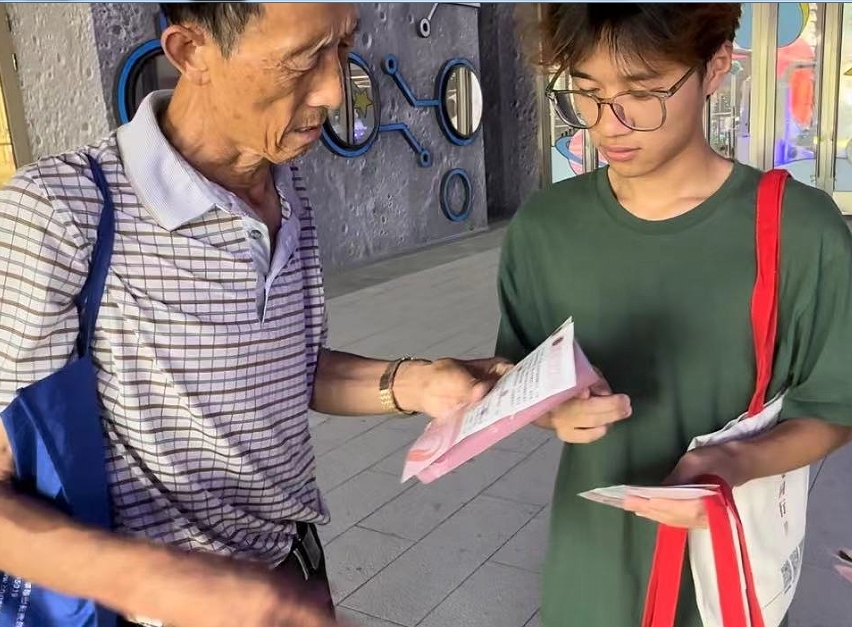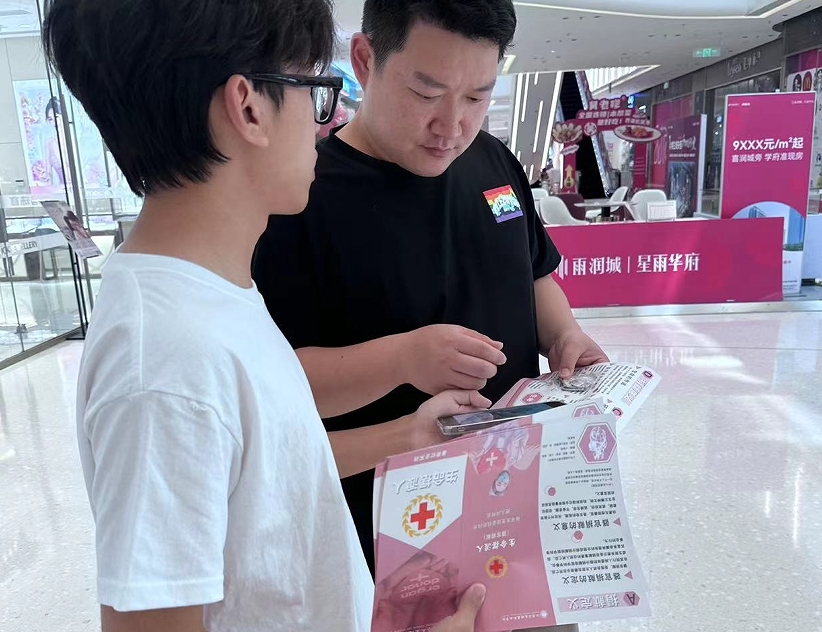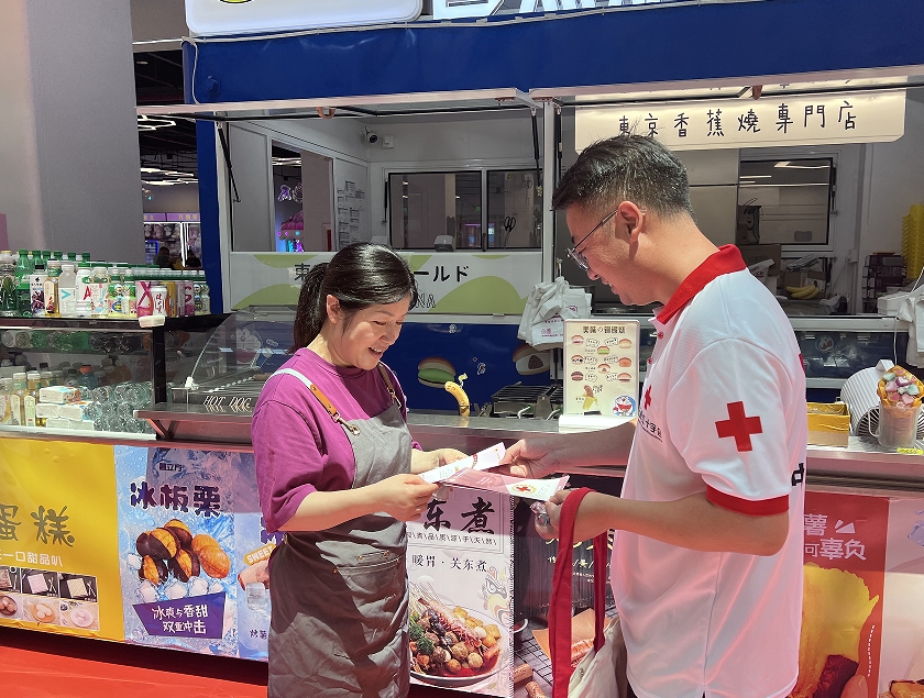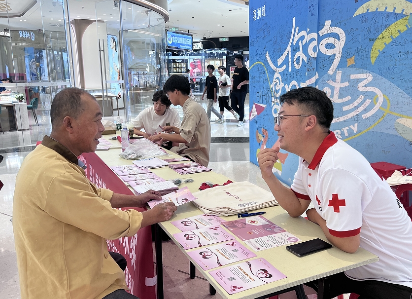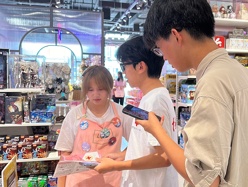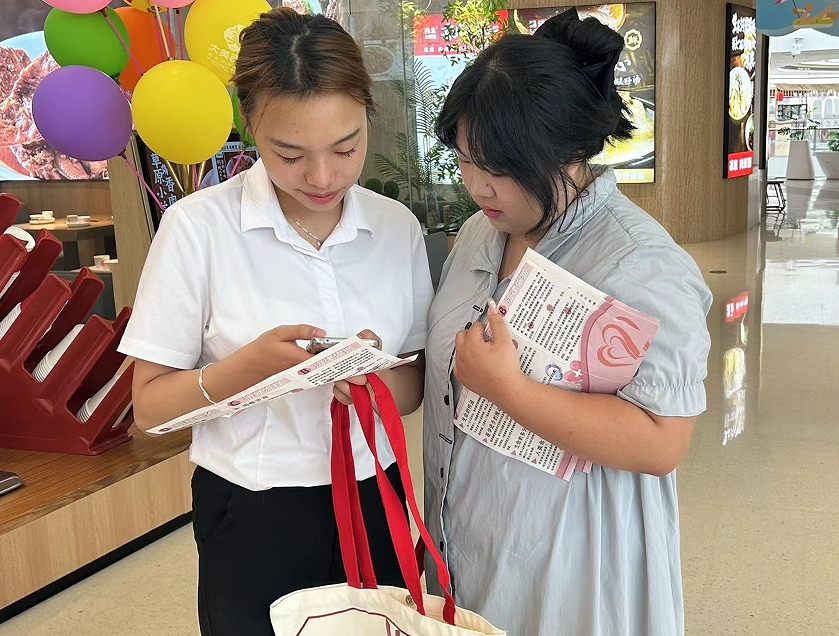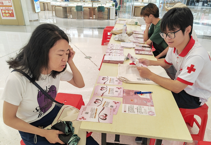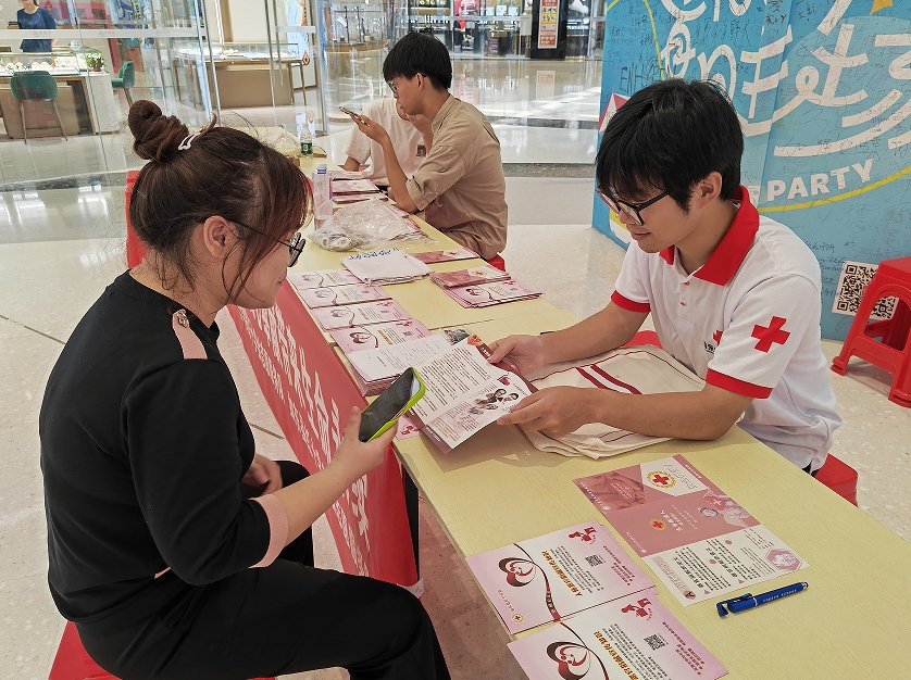 江苏卫生健康职业学院的红十字会志愿者们穿梭在商圈内,通过发放宣传单、科普知识册和三献纪念品,耐心细致的宣传、悉心服务做好推广。