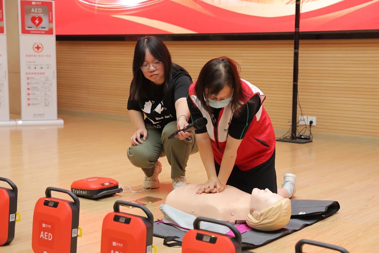 活动现场,红十字应急救护培训师培训老师为在场的公安干警等96位与会人员详细讲解AED的使用及心肺复苏技能,手把手教会受训者熟练掌握救护技能,有效解决设备投放场所人员不会用、不敢用的难题。