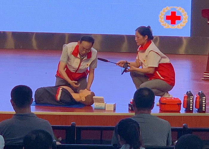活动现场,培训讲师通过PPT教学和实践操作相结合的形式重点讲解心肺复苏的操作步骤、AED除颤仪的正确使用方法,为让参训人员更好地掌握急救技能,讲师对胸外心脏按压、按压深度、按压频率等环节的操作要领和流程,逐一进行讲解和示范,并组织参训人员进行实操练习。