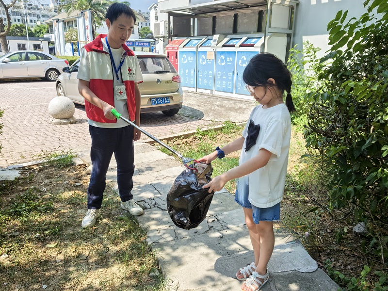 讲座结束后,红十字志愿者对参与本次讲座的青少年居民朋友们发起“低碳生活 绿色出行”的倡仪。倡导大家树立全新的生活观和消费观,减少碳排放,促进人与自然和谐发展。随后,红十字志愿者带领青少年们投身于小区环境的清洁行动,捡拾草坪中的废弃物,以实际行动呵护身边绿色生态环境。
