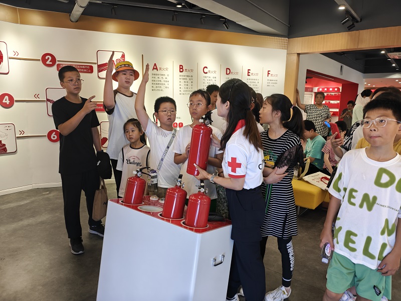 工作人员用生动的语言给同学们讲解了红十字的由来及发展历程。随后,在做好安全措施的情况下,工作人员通过“场景模拟+情景结合”的方式,带领青少年参观并学习、体验了火灾逃生、灭火器使用、心肺复苏等一系列安全知识。
