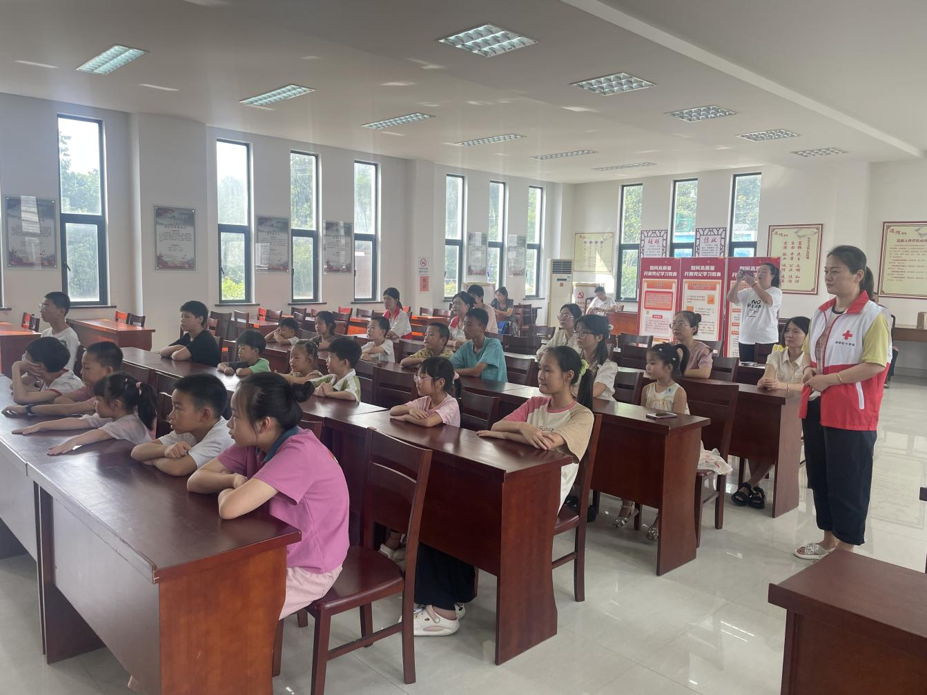 红十字会工作人员在现场时刻关注大家的上课纪律。少年强则国强,通过开展此次活动旨在引导青少年传承红色基因 、争做时代新人,从“知、学、行”三个维度自觉践行《中华人民共和国爱国主义教育法》,传承和弘扬爱国主义精神,让爱国主义的伟大旗帜始终在心中高高飘扬,努力成长为德智体美劳全面发展的社会主义建设者和接班人。