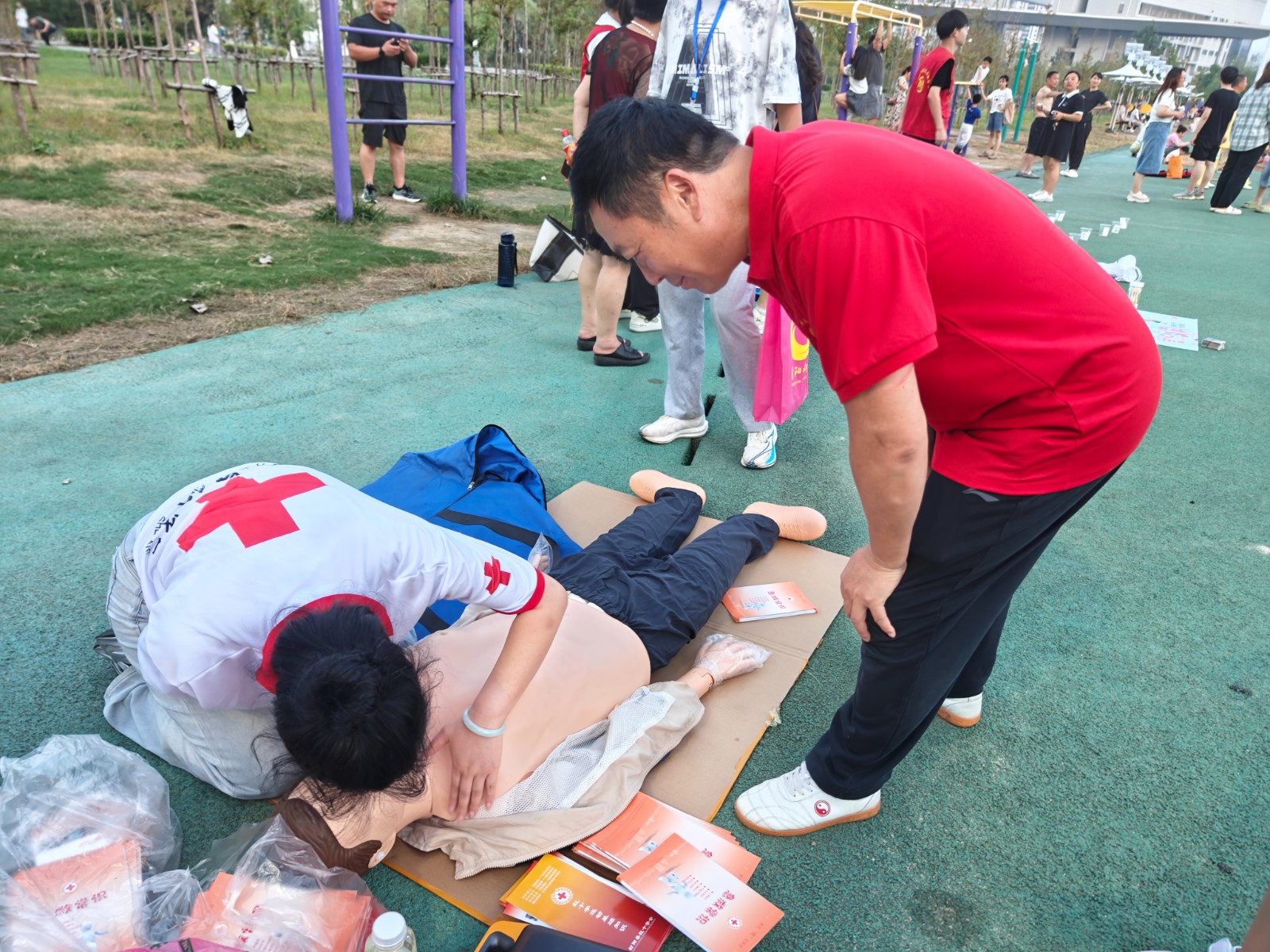 8月22日晚,“‘童’ 在蓝天下 筑梦共成长”爱心跳蚤市场义卖活动在射阳县全民健身中心体育场举行,县红十字会积极参与,向过往群众普及应急救护知识。