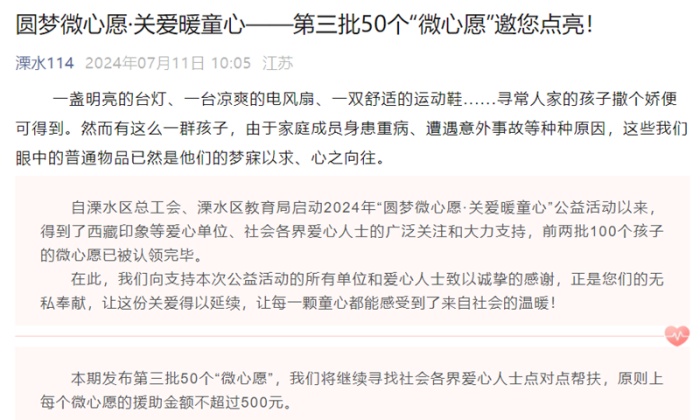 溧水区总工会、溧水区教育局于2024年暑期启动了“圆梦微心愿•关爱暖童心”公益活动,并在溧水114网站及溧水114公众号进行了发布。此次活动,得到了众多爱心单位、社会各界爱心人士的广泛关注和大力支持。