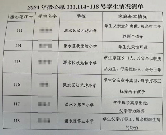 在接受捐助的6位学生中,第114号学生小瑞患有先天性耳聋,其心愿是拥有一张购书卡。小瑞在心愿单中写道:“我是一名六年级的小学生,先天性耳聋,人工耳蜗每年的电池和配件更换费用很高,给家里带来了不少的负担。我的微心愿是希望有一张购书卡。”溧水114网号召更多的爱心人士及组织,一起投入到更多的公益事业中,为困难学子带来更多的希望之光。