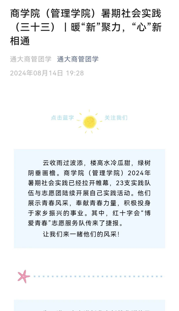 该团队合理使用公众号推文,抖音短视频,实时汇报项目开展情况,同步更新项目实施进度,形式多样,图文并茂,这一举措不仅提升了项目的透明度、增强了与公众的互动,还成功吸引了南通学习平台、通大红会、通大商管团学等多家媒体的关注与报道。在媒体的广泛传播下,项目的影响力不断扩大,赢得了社会各界的关注与赞誉。