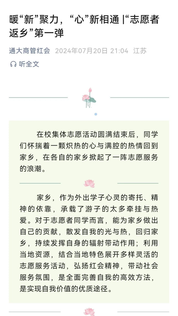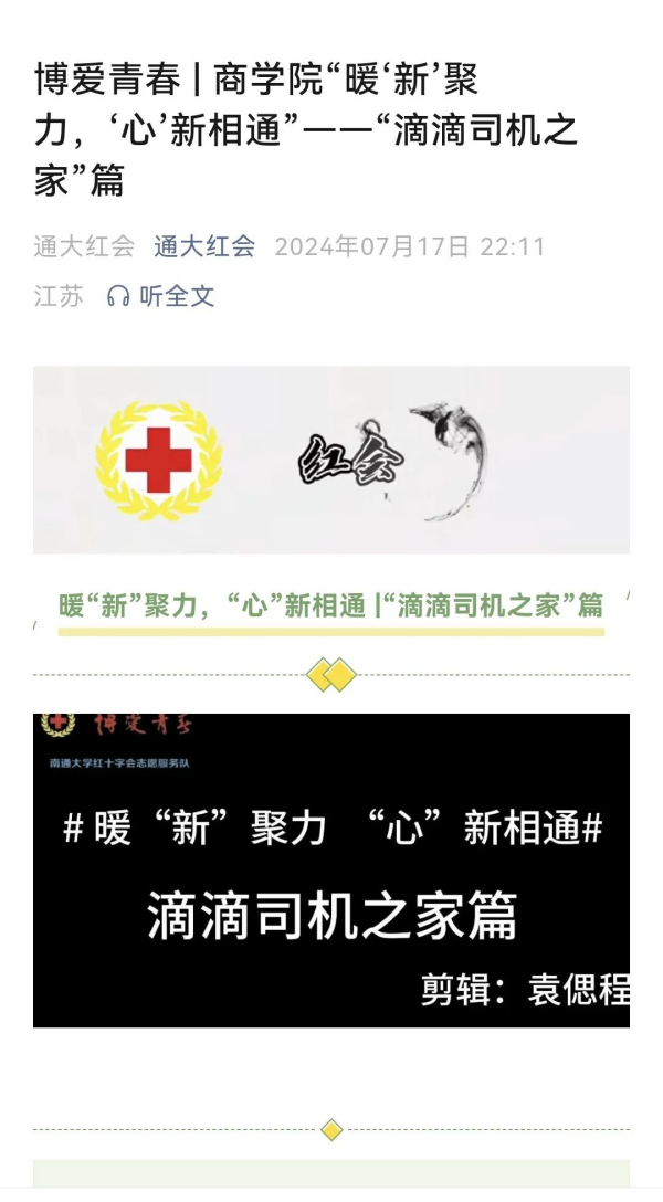 在这个悠长而热烈的暑假里,我作为南通大学经济与管理学院红十字分会“博爱青春”暑期志愿服务团队的一员,踏上了一段非凡的旅程。我们心怀梦想,志在四方,以满腔的热情和无畏的勇气,与新业态新就业群体紧密相连,共同编织了一幅幅温馨而动人的画面。“夏日炽热心亦热,志愿服务映日辉。” 不仅是对我们志愿行动的最好诠释,也是每一位参与者心中最坚定的信念。在南通市新业态新就业群体党群服务中心、圆融广场、滴滴司机党群服务中心等地,我们的身影忙碌而坚定,每一次服务都充满了真诚与关爱。在这个过程中,我收获的不仅仅是技能的提升和经验的积累,更是心灵的触动和思想的升华。最让我难以忘怀的,是与新就业群体的每一次交流。他们虽身处不同的岗位,面对着不同的挑战,但那份对生活的热爱、对工作的执着、对未来的憧憬,却让我深受震撼。他们的故事,如同夏日里的一股清泉,滋润了我的心田,也让我更加坚定了自己奉献社会、服务人民的决心。“穷山距海,不能限也。”这段志愿服务经历,让我更加坚信,只要我们心怀红十字精神,对想做、爱做的事敢试敢为,就一定能够跨越重重困难,实现自己的梦想。未来,我将继续秉承“人道、博爱、奉献”的红十字精神,用自己的实际行动去温暖更多的人,让青春在奉献中绽放光彩,让生命在关爱中得到升华。