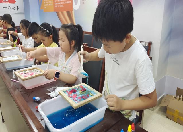 接着,孩子们迎来了充满乐趣的动手制作环节。他们的面前摆放着一盆盆清水、五彩斑斓的颜料、带有花卉的纸等材料,宛如一个个小小的艺术家工作室。孩子们迫不及待地拿起工具,发挥着自己的想象力和创造力。有的孩子小心翼翼地将带有花卉的纸浸入水中,看着花卉的图案在水中慢慢绽放,如同魔法一般;有的孩子用颜料在纸上挥洒着自己的梦想,色彩交织成美丽的画卷;还有的孩子互相交流着创意,共同完成一件独特的作品。
