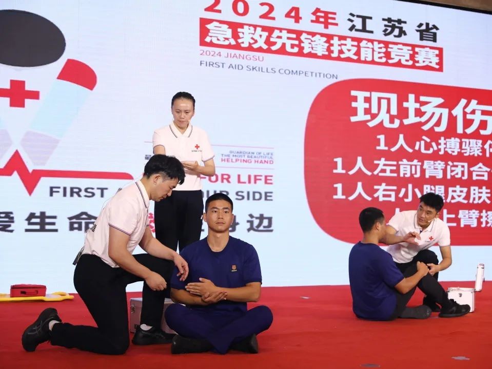 2024年“关爱生命 救在身边”急救先锋技能竞赛活动由江苏省红十字会联合中共江苏省委省级机关工委、江苏省总工会、江苏省教育厅共同举办。竞赛立足于传播红十字运动知识和群众性应急救护技能,面向一线应急救护培训师资,突出理论功底、实际操作与教学技能,提升师资教学水平。本次竞赛共有来自江苏省13个各设区市以及教育系统共计14支参赛队70名队员参加,内容分为理论考试、操作技能考核、主题演讲和场景演练四个部分,采取现场竞赛的方式,决出个人成绩和团体名次。理论考试采用闭卷考试方式进行,重点考查红十字运动知识和应急救护知识等相关理论。技能操作考核重点考查选手成人单人CPR+AED,止血、包扎、固定、搬运等创伤救护技能。主题演讲环节,围绕“我和红十字应急救护”主题,讲述参与救护培训、进行救护普及、实施现场救护的经历,阐明“我”对“红十字应急救护”的认识和理解。团体总分前三名参加场景演练角逐,通过模拟常见灾害事故现场,检验团队在实战环境下的的协调处置能力。
