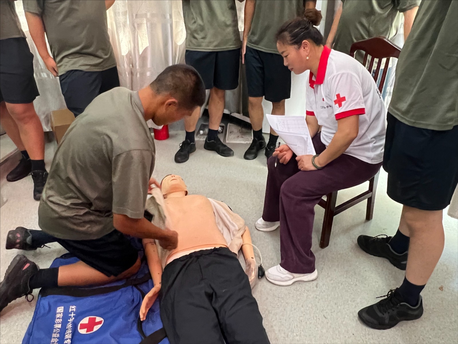 培训现场,红十字救护师资针对部队实际需要,采取理论授课、示范讲解、模拟练习相结合的方式,详细讲解了心肺复苏术、创伤救护、AED的使用、海姆立克急救法等救护知识,强调了急救操作过程中的注意事项。在实践操作环节,讲师对新兵进行手把手指导,纠正错误操作,演示正确手法,帮助学员掌握急救要点和操作流程。培训过后,新兵积极参与实操考核,95人线上报名,84名学员取得CPR+AED证书。