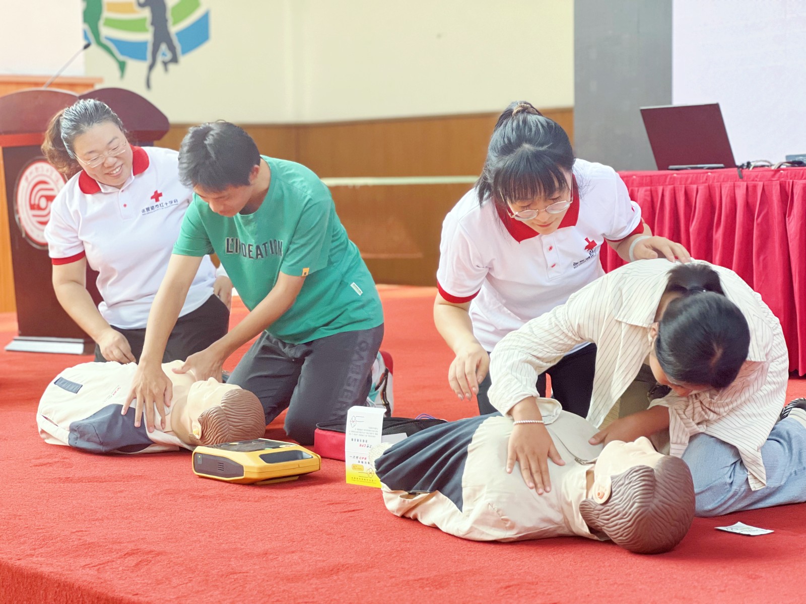 培训课上,红十字救护培训师结合“世界急救日”主题,对“急救与运动”相关知识进行了普及宣讲,并详细讲解了心肺复苏、AED使用以及气道异物梗阻的急救处理方法。红十字救援队成员进行了心肺复苏操作展示并指导学生进行实操演练,确保大家都能切实掌握正确的急救技能。