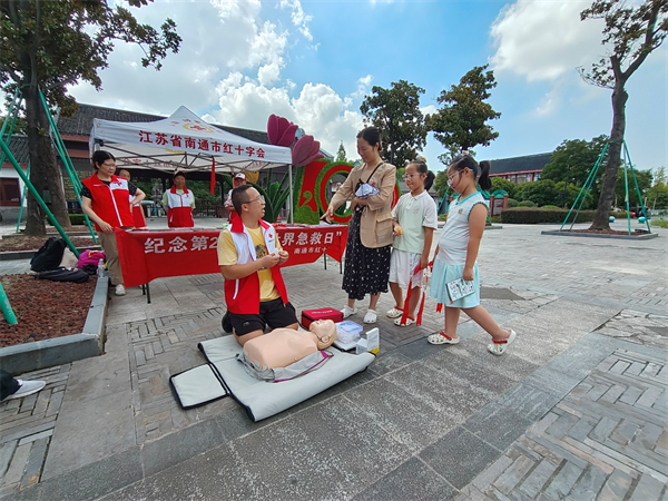 9月14日上午,在啬园景区,南通市红十字会组织救护师资通过现场互动教学、发放宣传资料等形式,在游客中开展应急救护技能宣传。