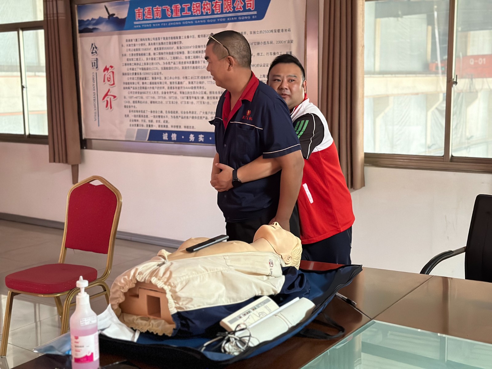 在“世界急救日”到来之际,近日崇川区陈桥街道育爱村博爱家园党员志愿者走进辖区南飞重工钢构有限公司,开展“博爱引领聚合力,急救培训进企业 ”培训活动。