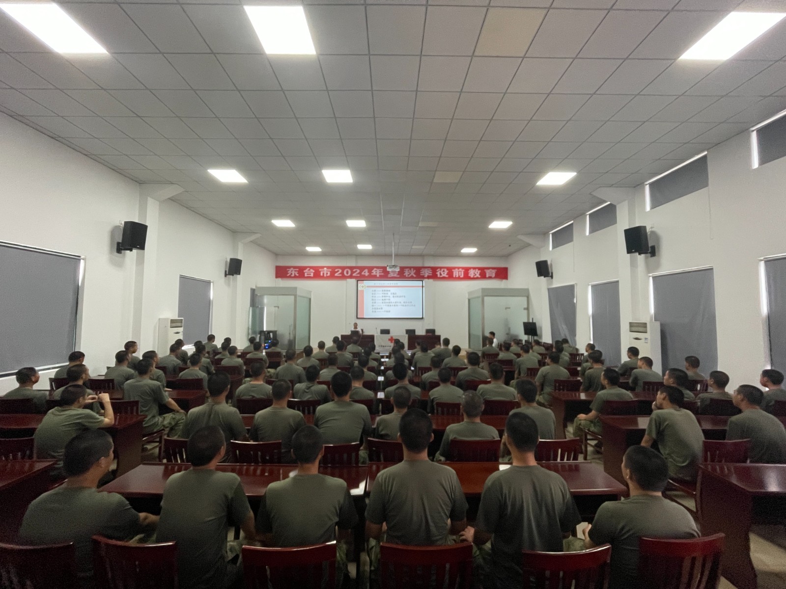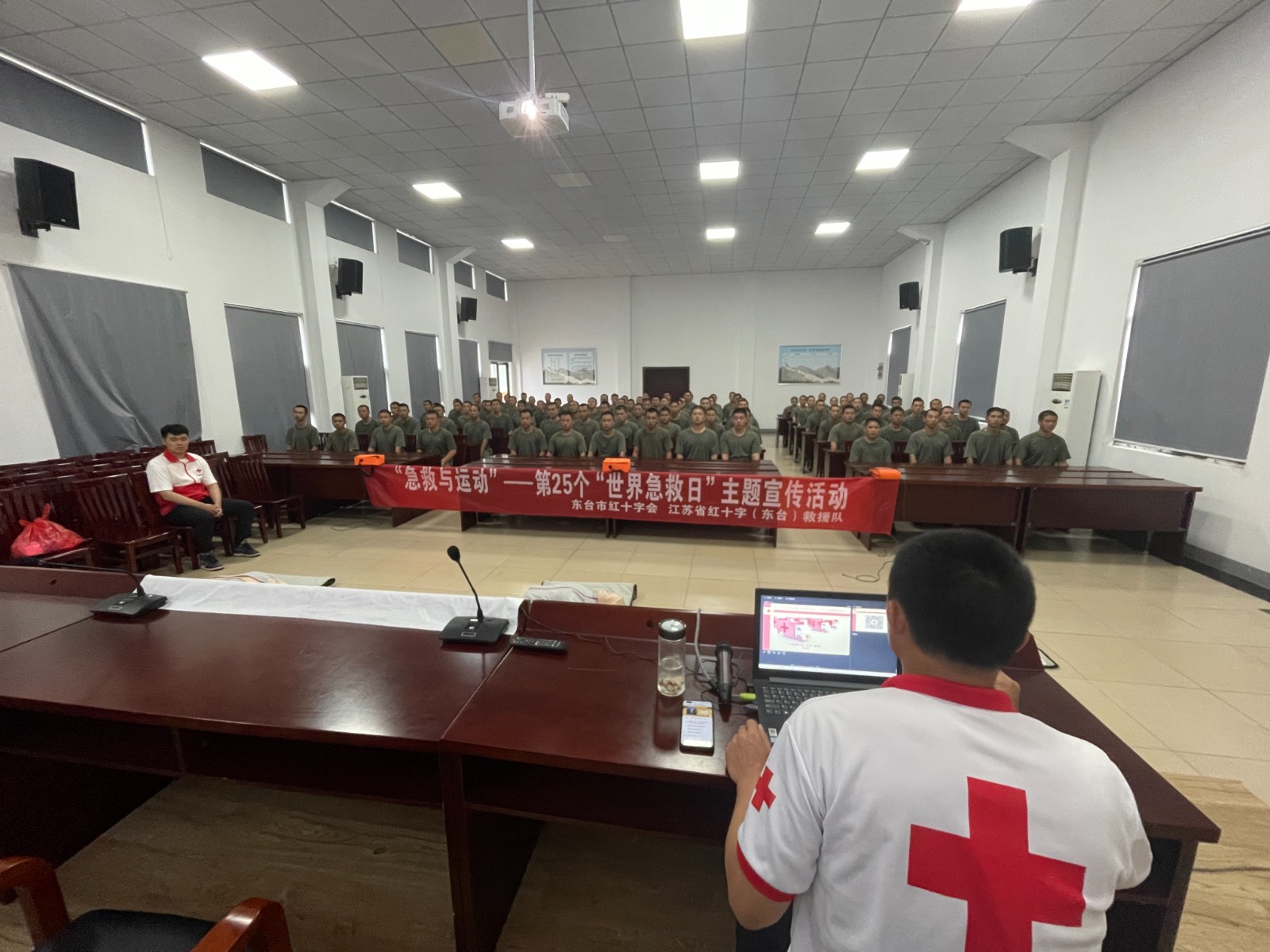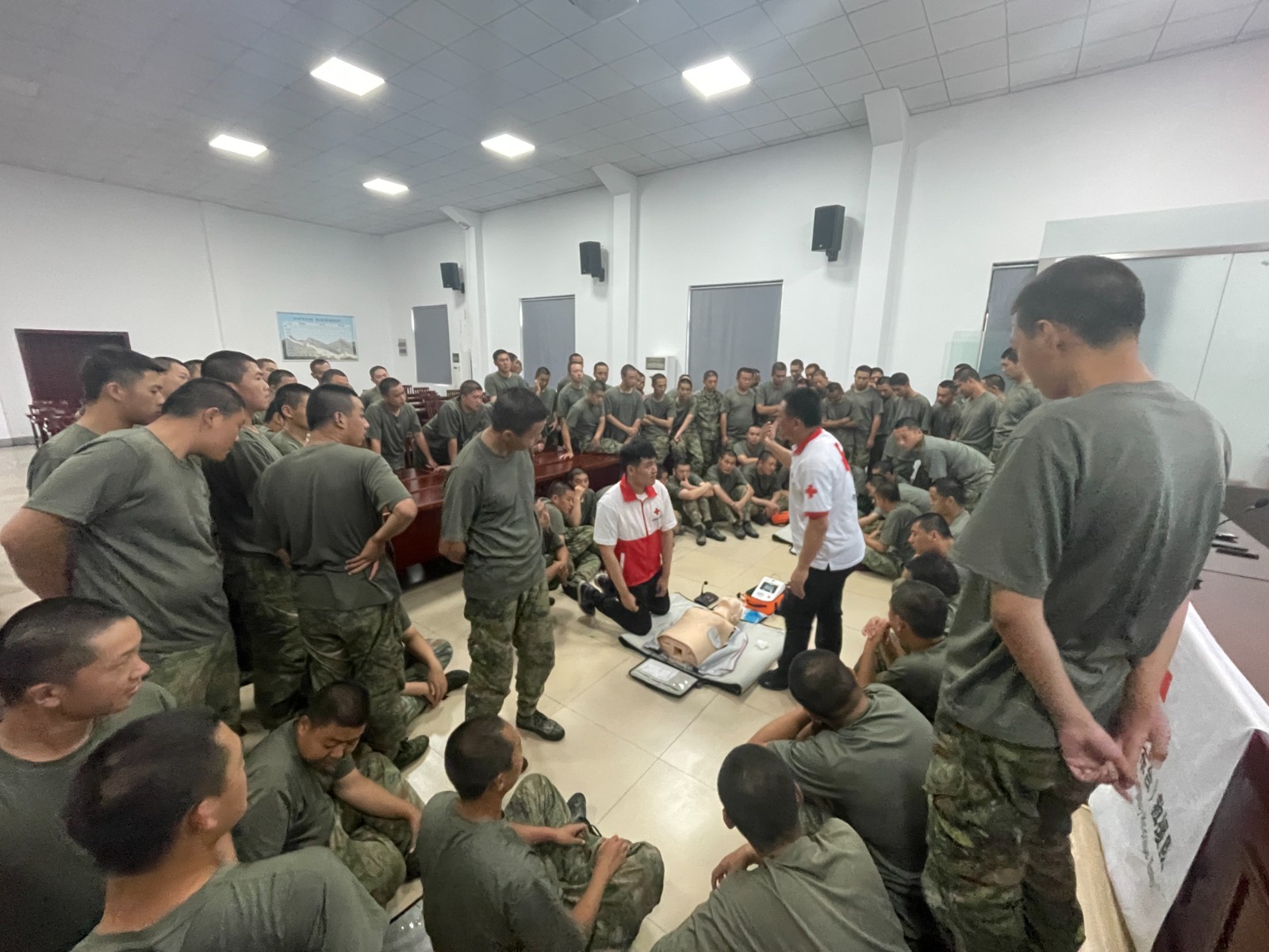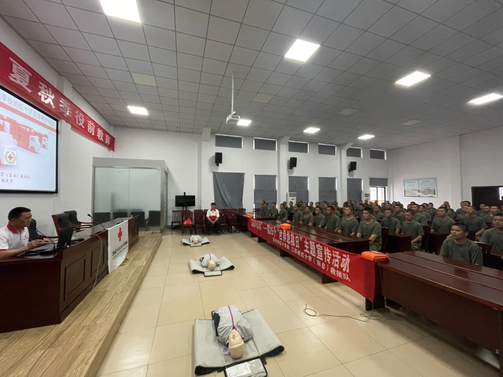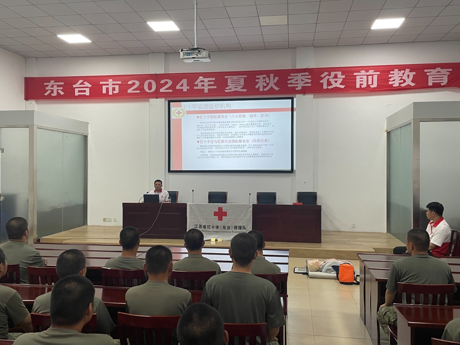 进一步普及应急救护知识,提升应征入伍新兵的应急救护能力。近日以来,东台市人武部开展2024年夏季新兵役前教育。9月17日市红十字会受邀对全体参训准新兵开展应急救护专题培训,提升新兵紧急救护意识,提高其应对突发事件和意外伤害事故的应急救援和自救互救能力,助力新兵迈好军旅第一步。培训过程中,救护培训师资通过人体模型演示,用通俗易懂的语言表述及动作展示讲解心肺复苏、头部外伤和肢体骨折的救护原理及技术要点,介绍急救的原则、程序、自我保护等方面的理论知识。为让大家更牢固地掌握急救要领,采取模拟现场情景演练的形式进行教学,一边进行技术指导,一边纠正大家的不规范操作。