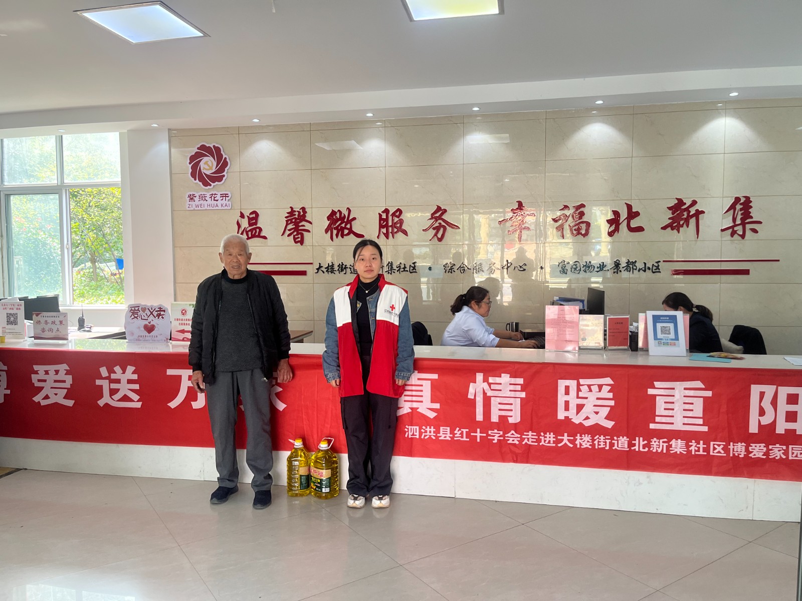 岁岁重阳,今朝又重阳。为弘扬中华民族敬老、爱老、助老的传统美德,扎实有效地开展好常态化博爱送万家活动。10月11日,泗洪县红十字会走进博爱家园为社区困难老人们送去节日的慰问和祝福。