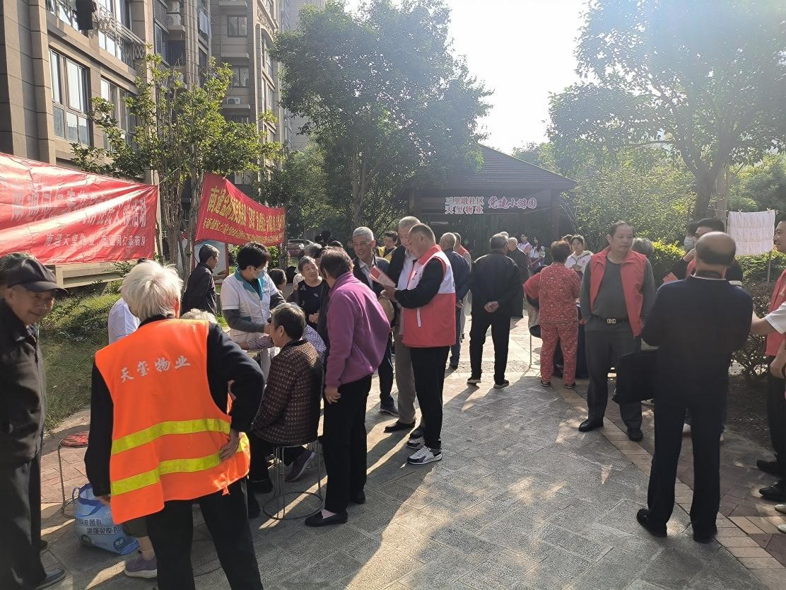 重阳佳节期间,文峰街道三里墩花苑小区三期广场洋溢着浓浓的温情,由社区红十字会、新时代文明实践站、工会与天玺物业公司携手举办的重阳节志愿服务活动在这里如期举行,为辖区老年人提供一系列贴心、专业的免费服务,让他们在节日里感受到来自社区的关怀与温暖。