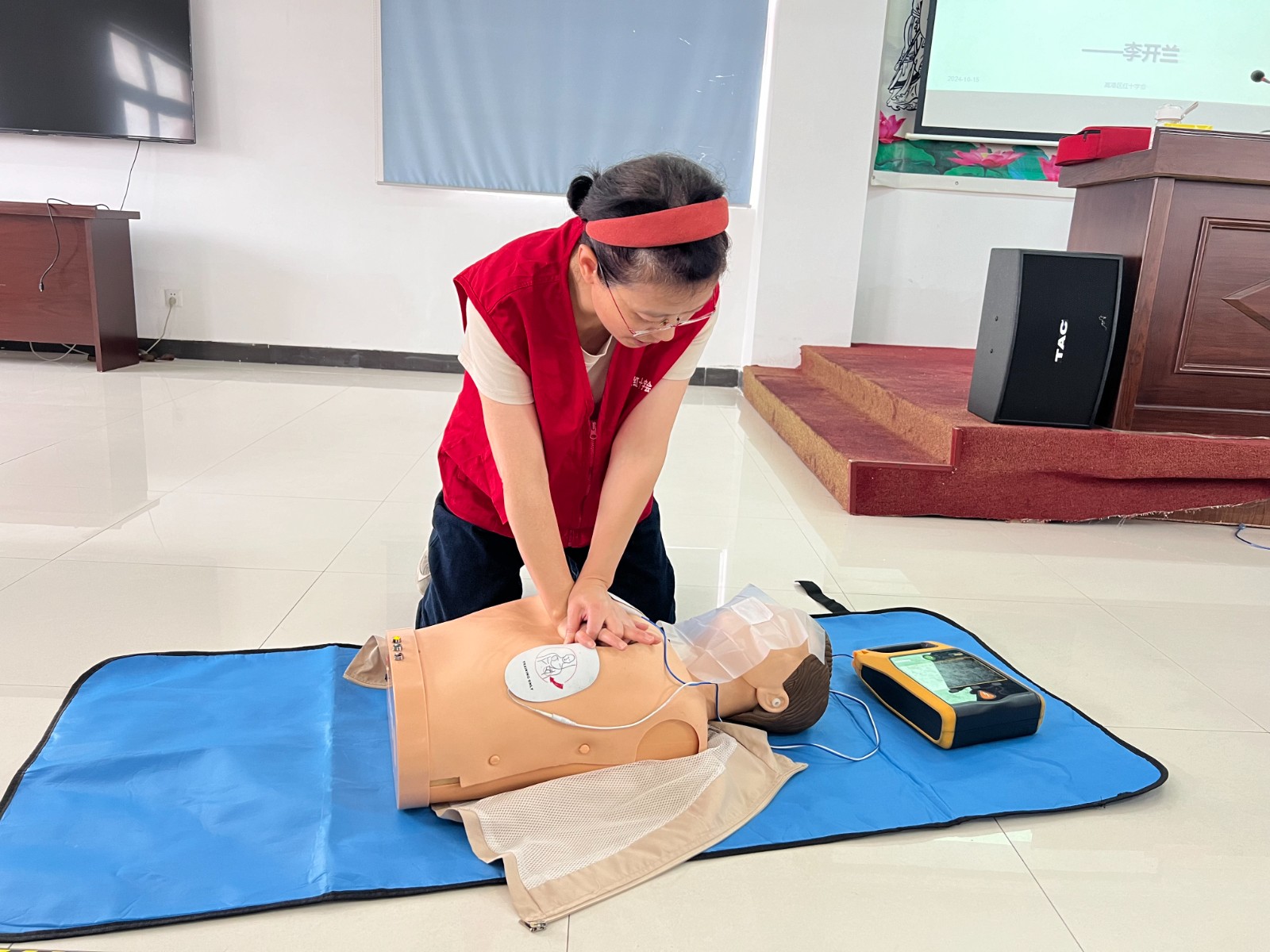 培训共分为理论教学和实践操作两个部分。李开兰老师讲述了心肺复苏术的基本原理,了解到呼吸骤停黄金救援时间4分钟的重要性,演练了急救员在应急救援现场的基本步骤。随后以生动的实例讲授了心肺复苏、气道异物阻塞、创伤救护等课程,并演示了心肺复苏术、人工呼吸法、“海姆立克”急救法、绷带包扎等紧急救护技术。