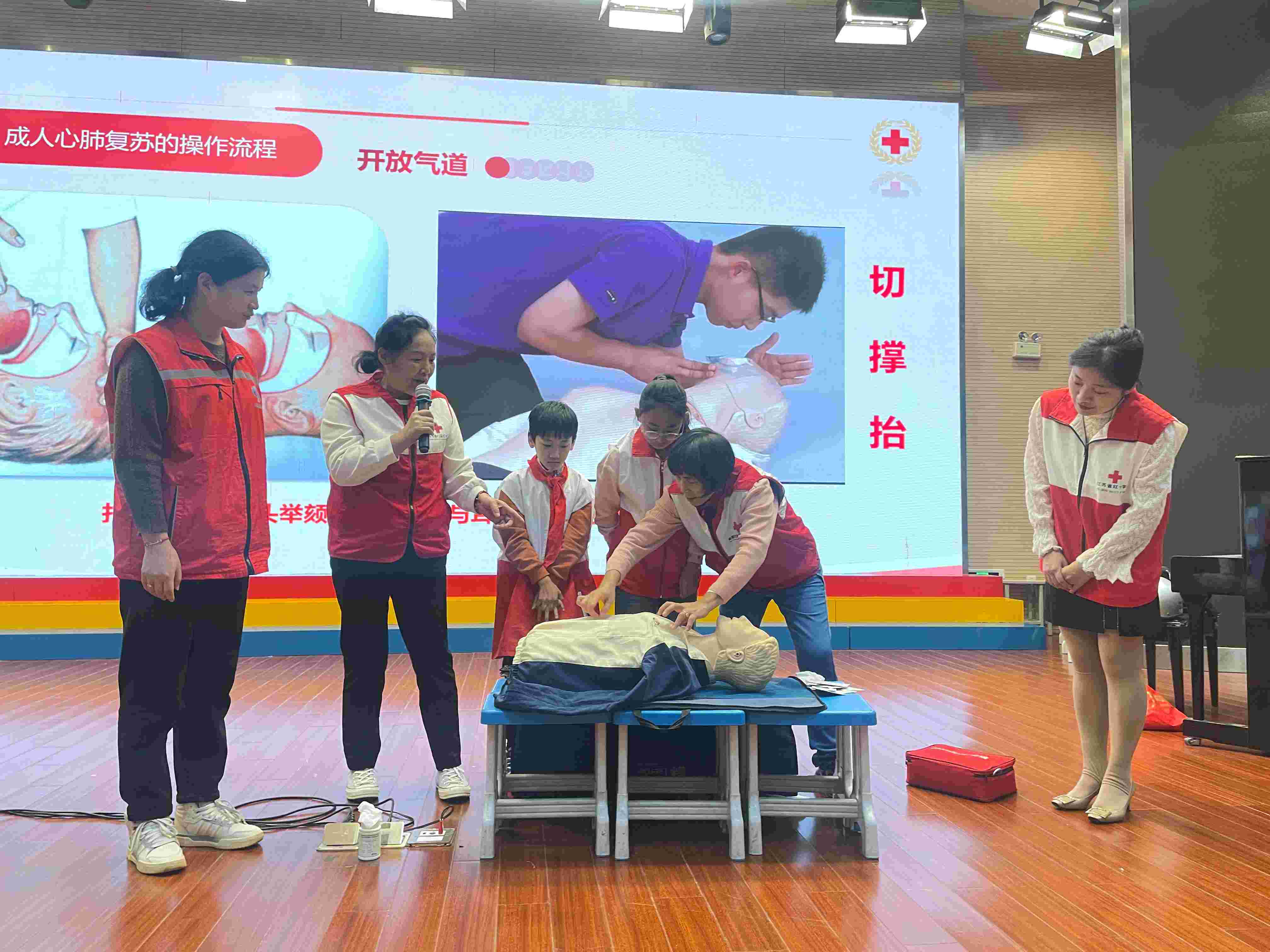 随后,活动进入了实操演示环节。区红十字会的老师们现场示范了正确的急救操作步骤,每一步都细致入微,确保每位参与者都能清晰掌握。尤为值得一提的是,本次活动还特别邀请了学生代表上台,与老师一同进行实操演示。学生们在老师的指导下,认真模仿每一个动作,从判断意识、呼叫救援到实施心肺复苏,每一步都力求准确到位。这种“师生同台”的模式不仅增强了活动的互动性,也让学生们在实践中加深了对急救知识的理解,更激发了他们成为未来社会急救力量的潜力。