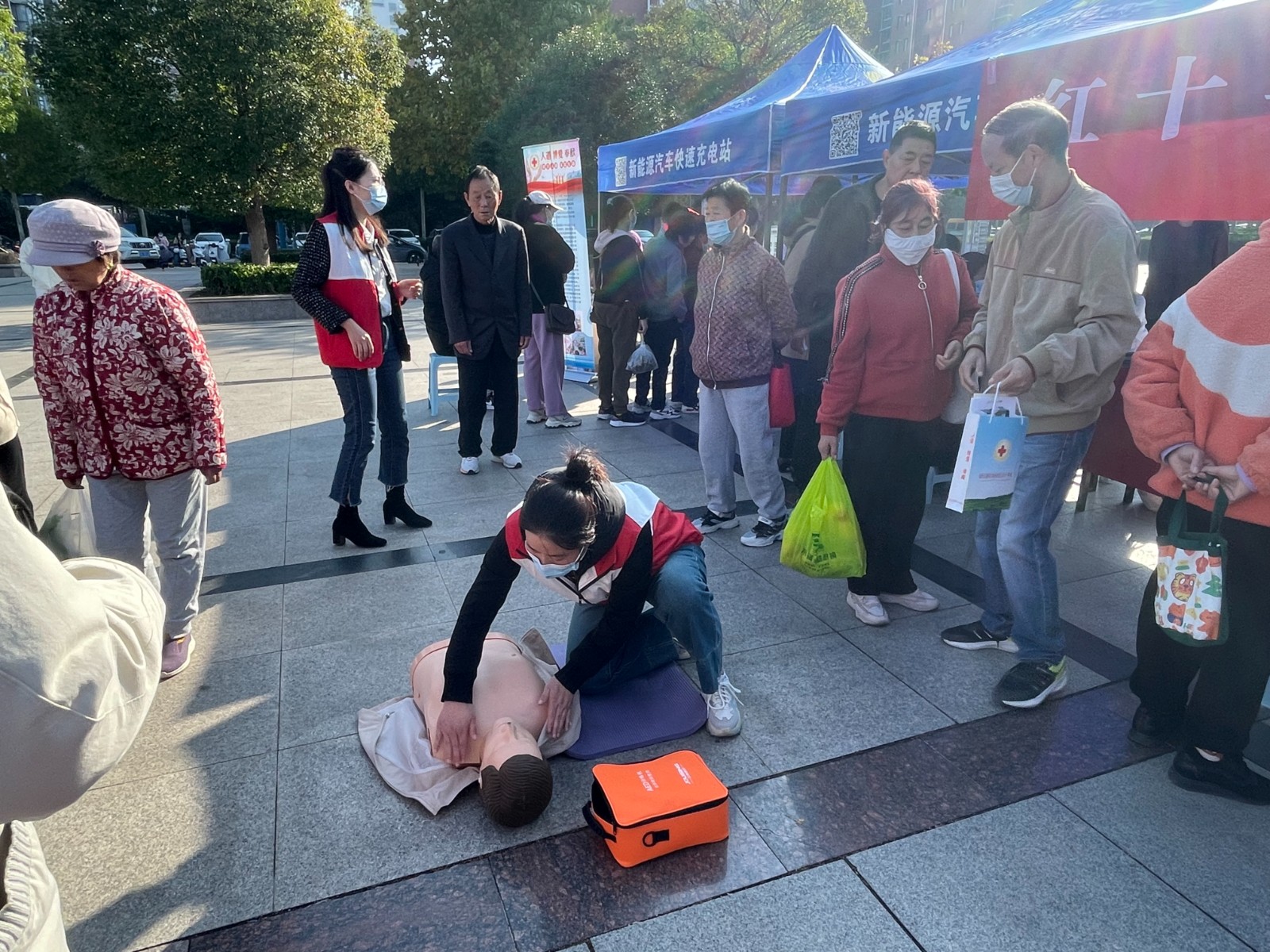 红十字救护培训讲师还现场演示了心肺复苏、创伤救护、AED使用等急救技能,并热情邀请现场观众一同参与练习操作,吸引了不少群众前来体验。