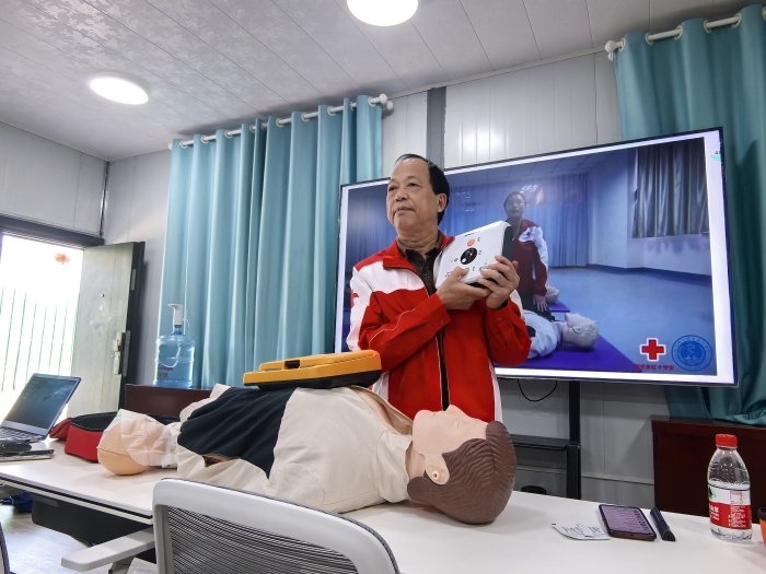 区红十字会救护培训讲师通过理论讲解、现场演示、实践操作和模拟演练等多种形式,为学员们进行了生动细致的教学。培训现场学习氛围浓厚,在心肺复苏实操环节,讲师利用模拟人详细演示了胸外按压、人工呼吸的操作要点和注意事项,并指导学员们逐一进行练习。创伤救护课程中,学员们认真学习了止血、包扎和固定等技术,通过互相模拟受伤场景,大家进行了实际操作。