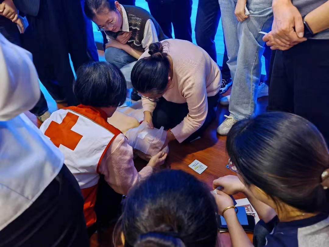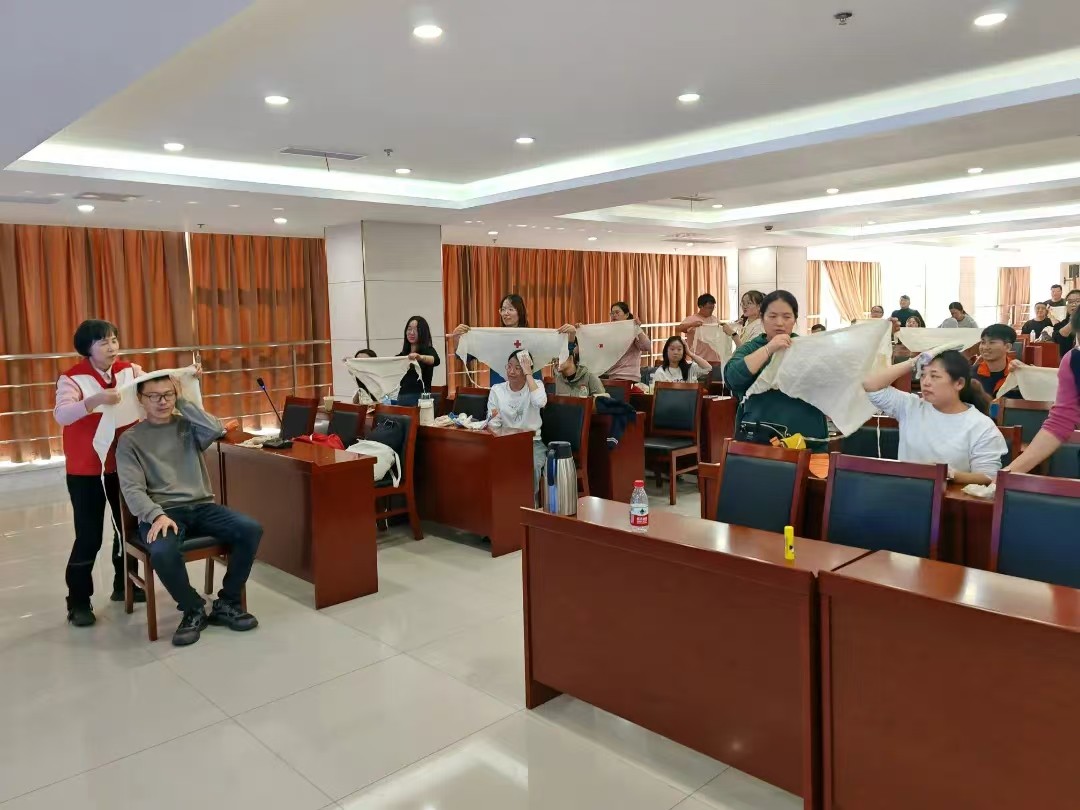 本次活动分技能实操培训和实战演练两个阶段。上午,来自海门区红十字会的老师们紧扣应急处理的要求,通过模拟人体现场示范操作,详细讲解了心肺复苏(CPR)和自动除颤装置(AED)的使用、烧烫伤现场处理等基本救护知识。课堂上,老师们运用情境式、问题式等教学手法,引导学员们深入思考、积极讨论。学员们认真听讲,在理论考试中沉着应答,实操考核中规范操作,培训合格后均获得了红十字会初级救护员证书。
