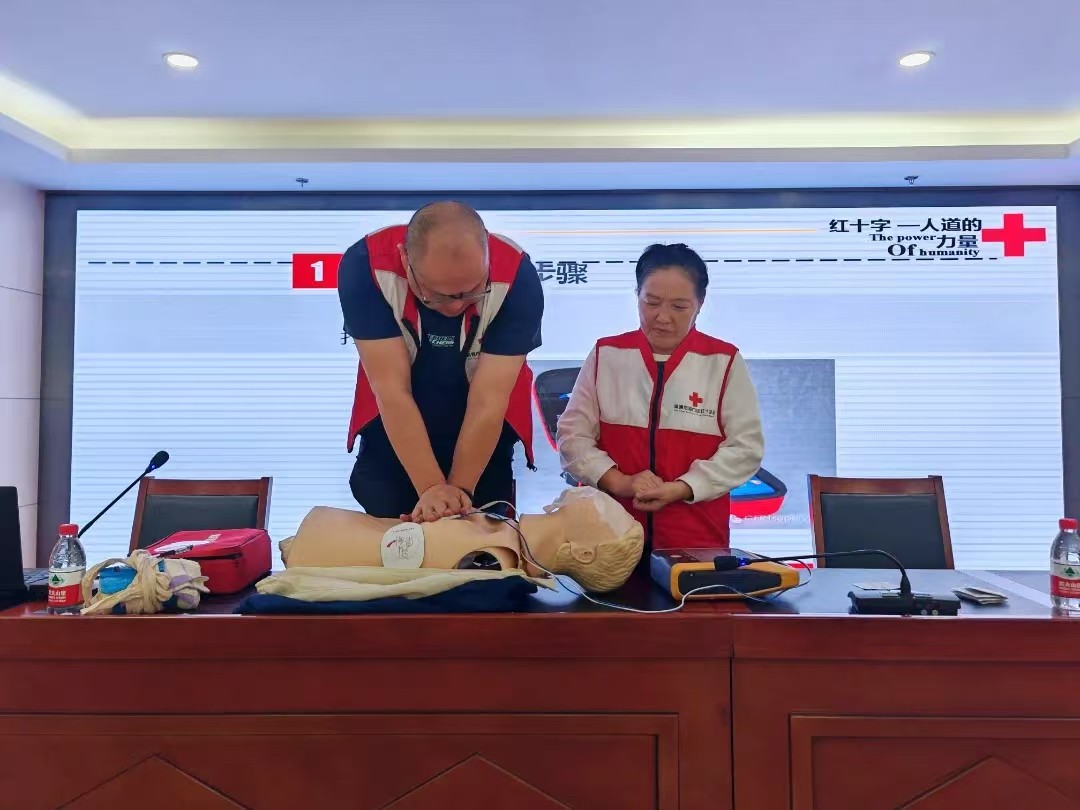 在随后的技能实操环节,学员们展示了上午学习的成人单人心肺复苏(CPR)和自动除颤装置(AED)使用、烧烫伤现场处理的成果。他们熟练的操作和准确的动作得到了海门区红十字会老师的肯定。