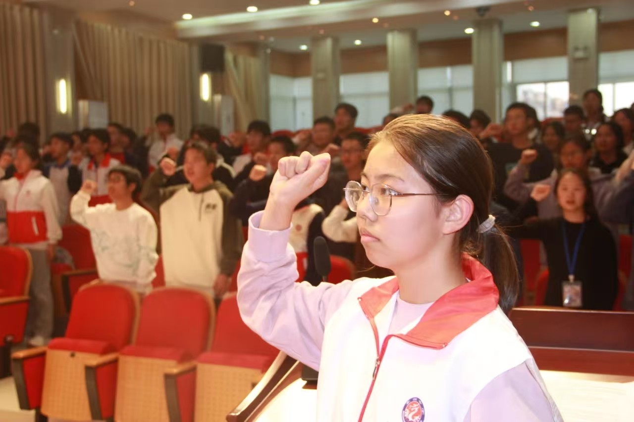 “我志愿加入中国红十字会,自觉遵守《中国红十字会章程》,坚持弘扬‘人道、博爱、奉献’的红十字精神……”,在主持人的带领下,全体入团积极分子起立,右手握拳,庄严宣誓,誓言铿锵有力,表达了同学们对红十字精神的崇高敬意和坚定信念。