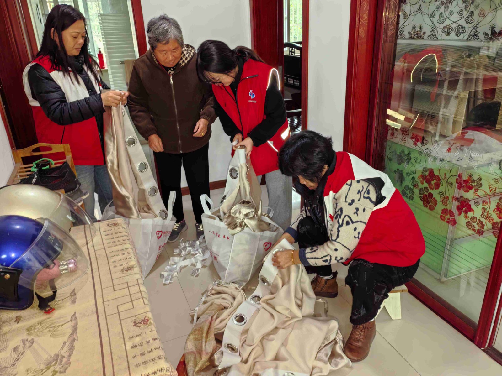 志愿者和社区工作人员上门将老人家中卧室、客厅的窗帘拆卸并整理收集,收集好送到洗衣坊进行消毒、清洗、烘干,在清洗完成后,再由志愿者和社区工作人员送回并进行安装。