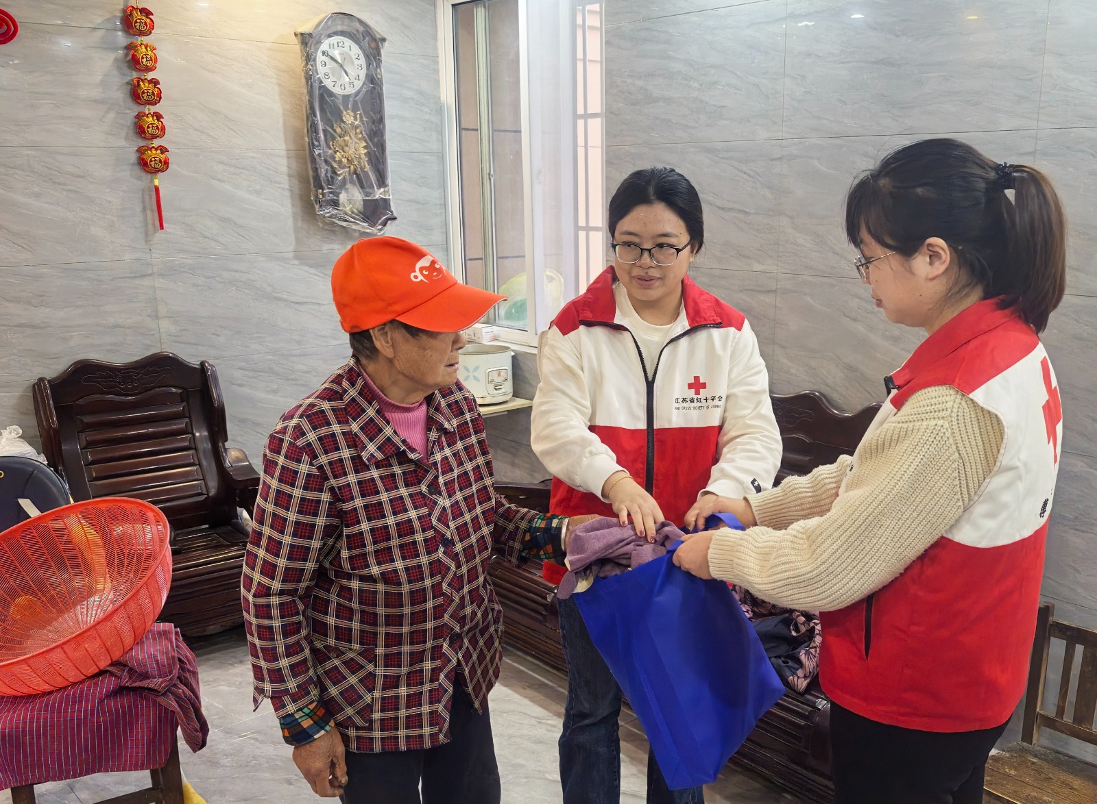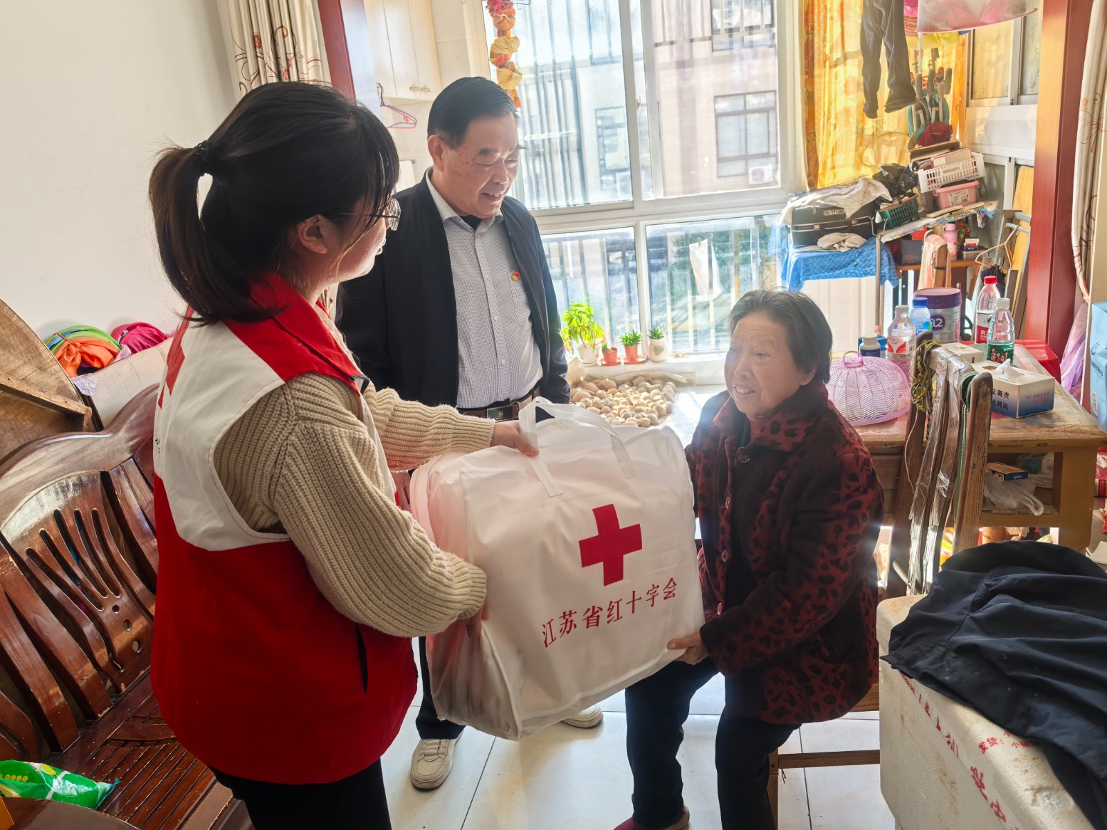 博爱家园志愿者走访小区独居老人,与他们亲切交谈,了解老人的生活状况和需要,送上温暖棉被,提醒老人注意季节变化,做好防寒保暖,不仅让老人获得物质上的帮助,更在精神上感受到红十字的关心关爱。
