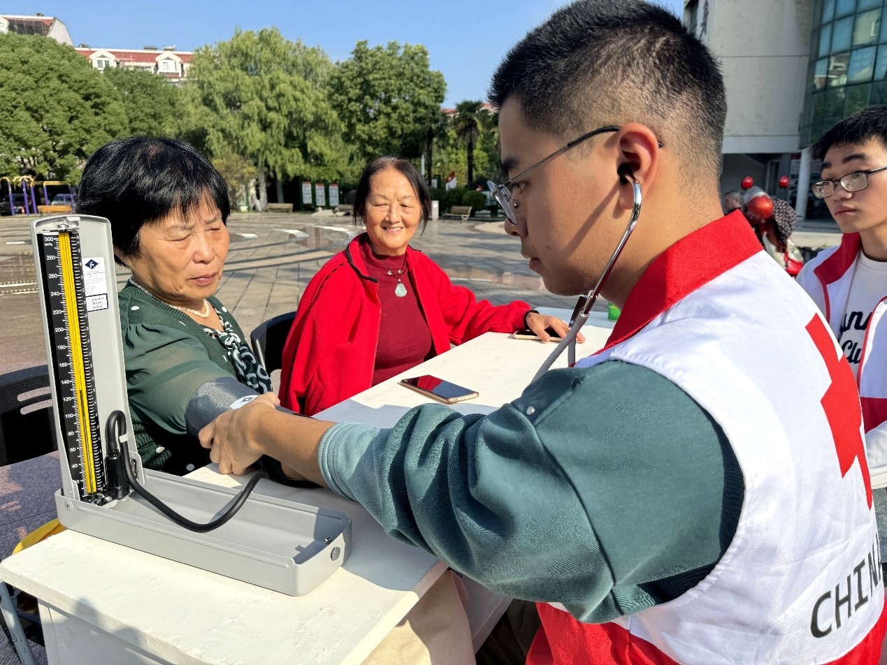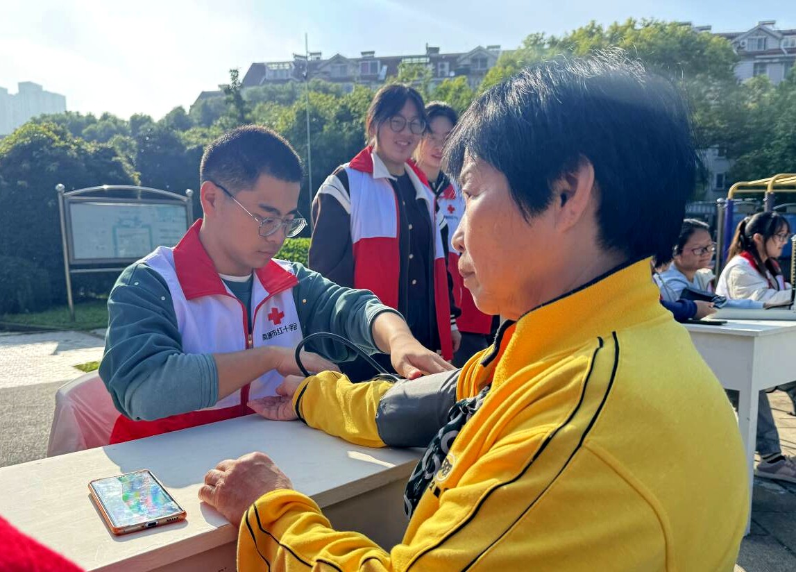 活动现场,来自南通大学医学院的红十字志愿者们早早地布置好了场地,准备好各类医疗检测设备,以热情饱满的状态迎接前来参加义诊的老人。量血压、测血糖等基础检测项目有序开展,老人们在志愿者的引导下,排队依次进行检测。红十字志愿者们仔细地为每一位老人测量血压,认真记录数据,并针对血压偏高或偏低的老人给予专业的饮食和生活建议。在测血糖区域,志愿者们手法娴熟地为老人采集指尖血,快速得出血糖数值,对于血糖异常的老人,耐心叮嘱其后续注意事项。